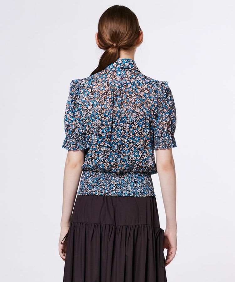 全面にあしらった小花柄と黒のリボンが、クラシカルなムードを演出するシフォンブラウス。軽やかな素材感が、女性らしいやわらかさを引き立てます。胸元と袖口にはたっぷりとギャザーを施し、華やかな表情に。ロングスカートでフェミニンに、シンプルなパンツと合わせて品よく着こなすのもおすすめです。
