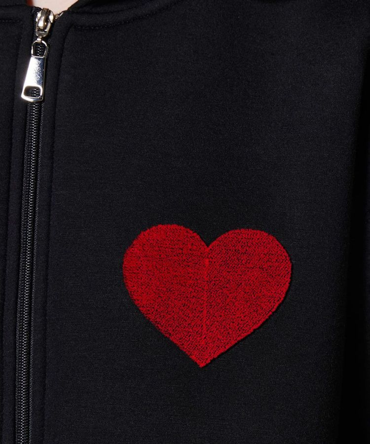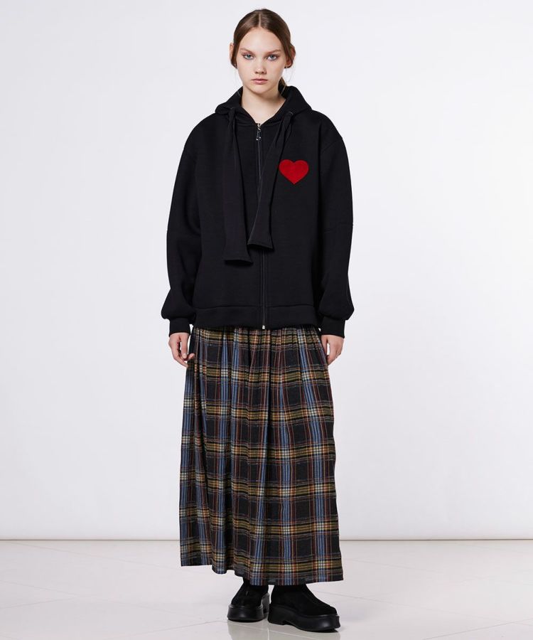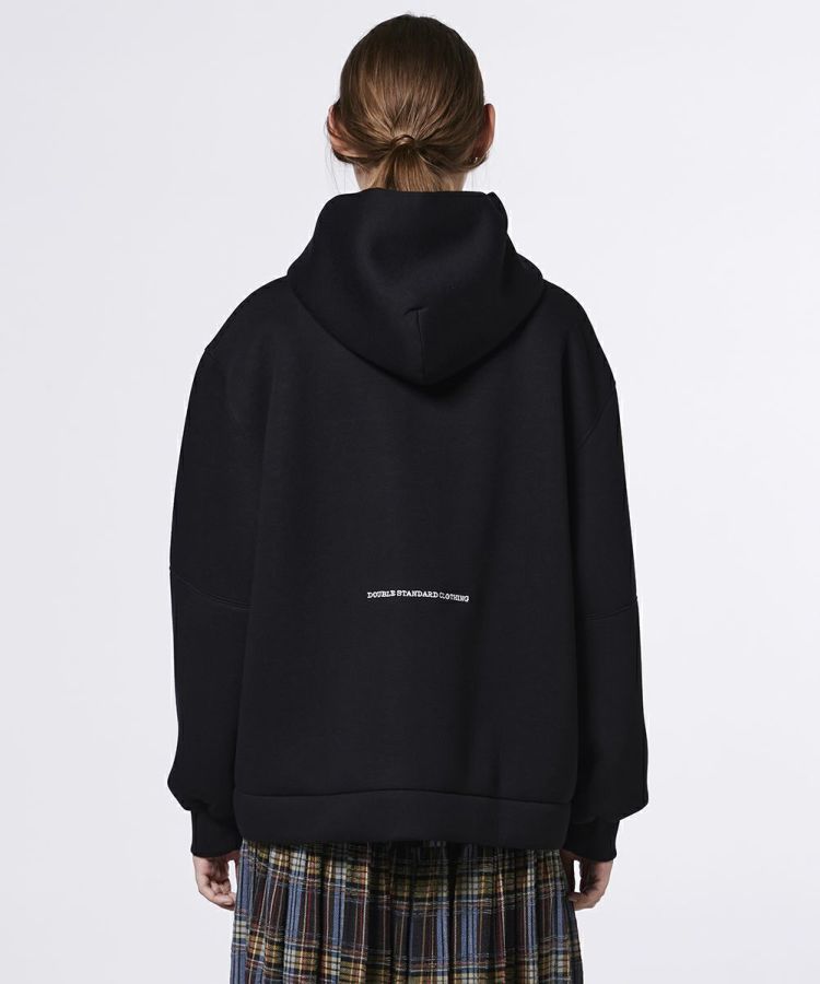 ハートのワッペンと太めのリボンがアクセントになった、オーバーサイズのスウェットパーカー。マニッシュな印象のパーカーを、ダブスタらしくフェミニンにアレンジしました。袖の切り替えによる立体的なシルエットや、背面のさりげないロゴ刺繍など、360度どこから見てもデザイン性の高い一枚。エッジの効いた大人フェミニンなムードで、カジュアルながらも女性らしさを演出します。