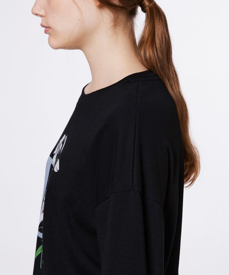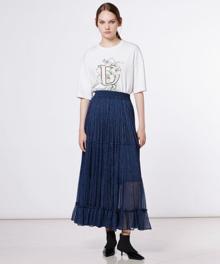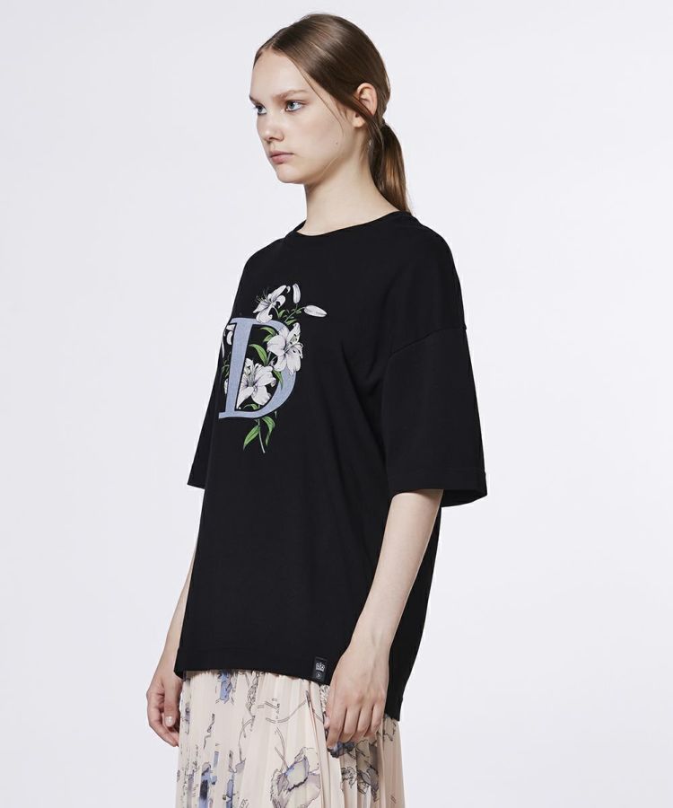 「D」のロゴとフラワーモチーフのグラフィックが目を惹く、大人カジュアルなTシャツ。ダブスタ定番のフライス生地を使用し、端番手ならではの絶妙な厚みとハリ感で、上品な着こなしを叶えます。デニムやロングスカートなど、さまざまなボトムスとも相性が良く、使い勝手も抜群です。