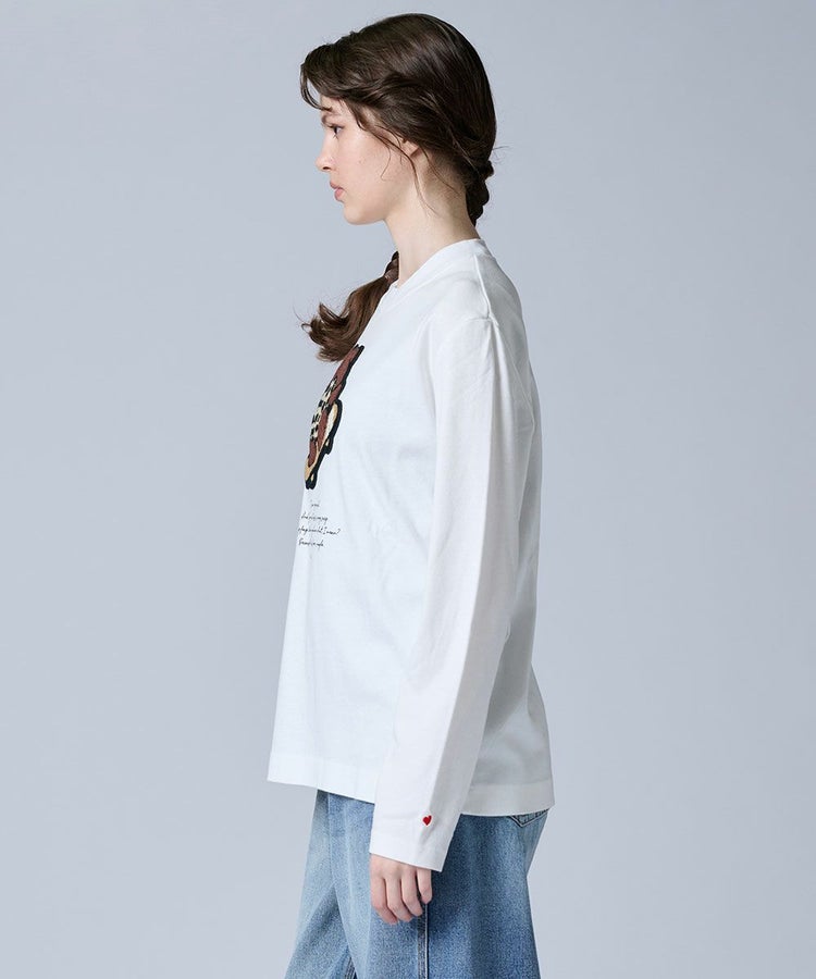 コットン100%のやわらかな肌触りが心地よい長袖Tシャツ。フロントには、Night Storeで人気のDSCのアイコニックBEARを、スケートボードで遊ぶ後ろ姿にアレンジしたワッペンをプラスしました。シンプルながらもユーモアの効いたデザインで、大人カジュアルなスタイルにぴったり。デニムやスカート、ワイドパンツなど、どんなボトムスとも相性がよく、デイリーに活躍してくれる万能アイテムです。