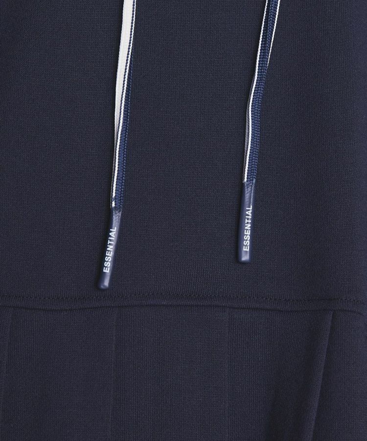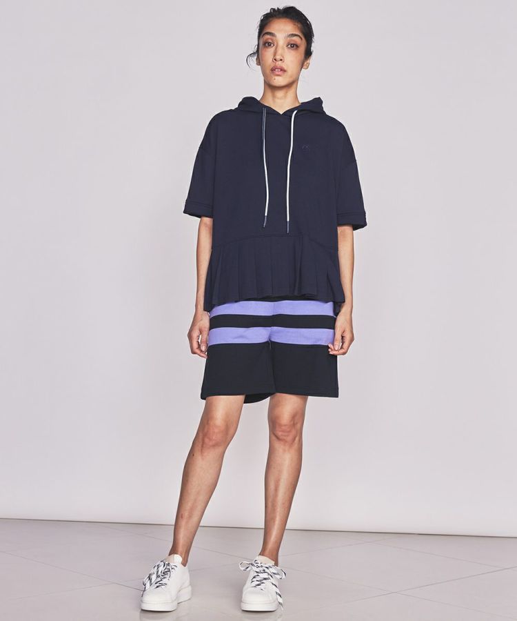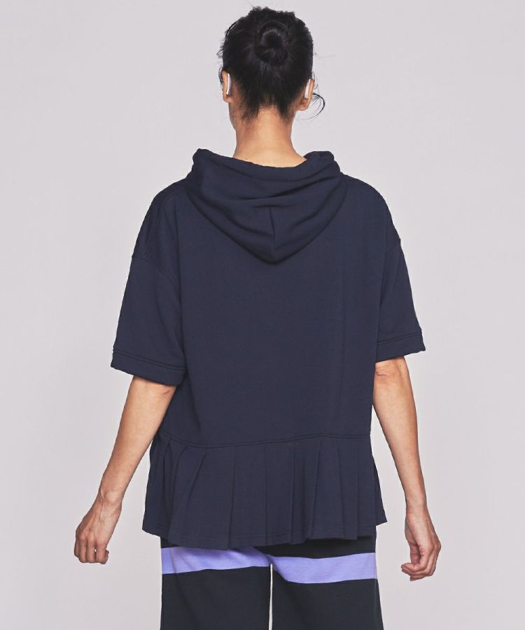 きれいめな印象の半袖パーカー。リサイクルポリエステル糸を使用したサステナブル素材で、綿のような風合いがありながらも、吸水速乾性と形態安定性に優れています。ポリエステルの裏毛の性質を活かしてプリーツ加工を施しているのもポイント。コーディネートのアクセントになり、カジュアルでありながらもフェミニンなムードに着られます。オリジナルのスピンドルがスクエアタイプなのもこだわりです。