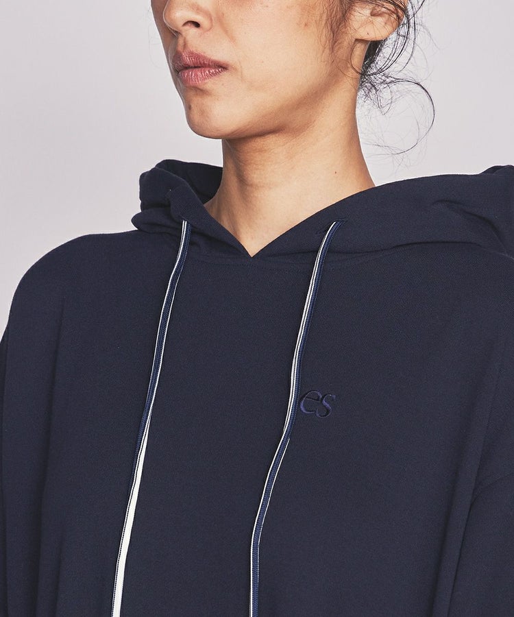 スポーティーでありながらきれいめな印象のパーカーワンピース。リサイクルポリエステル糸を使用したサステナブル素材で、綿のような風合いがありながらも、吸水速乾性と形態安定性に優れています。夏場に楽チンな着心地でイージーケアなのが魅力的。ポリエステルの裏毛の性質を活かした裾のプリーツ加工もポイントで、歩くたびに裾が揺れるのがかわいい。オリジナルのスピンドルがスクエアタイプなのもこだわりです。
