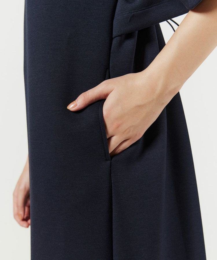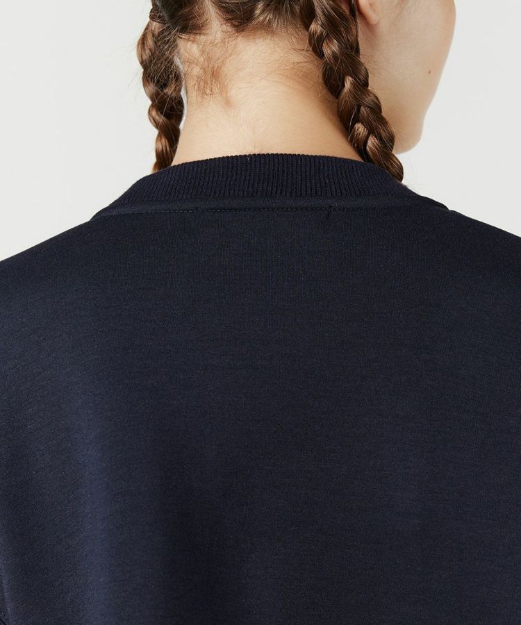 ワイドシルエットでありながら、バックにスリットを入れてメリハリを出したワンピース。程よいハリ感のある裏毛素材が立体的なフォルムを出してくれるため、スポーティーでありながらモダンに着られるのが魅力です。二の腕を自然にカバーしながら、手元をすっきり見せてくれるのもうれしいポイント。袖に施したロゴパッチも高級感のあるアクセントになっています。