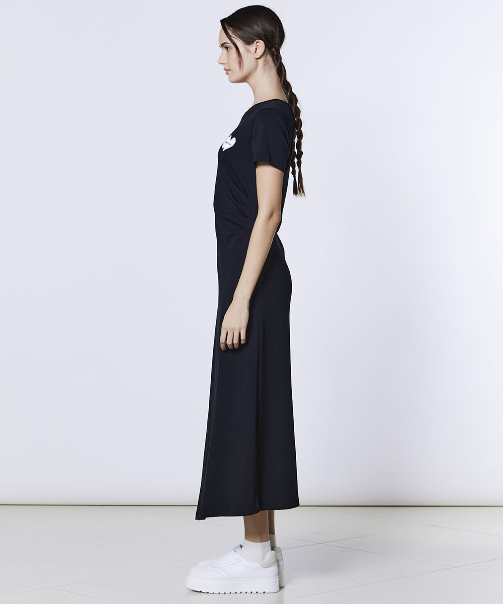 一枚でスタイリングが決まる、使い勝手の良いTシャツワンピース。ウエスト部分にさりげなくギャザーを寄せ、リラックス感がありながらも女性らしいシルエットに仕上げました。胸元にはハートモチーフをあしらい、デザインのアクセントをプラス。タウンユースはもちろん、レジャーやアウトドア、キャンプなど、幅広いシーンで活躍する一着です。