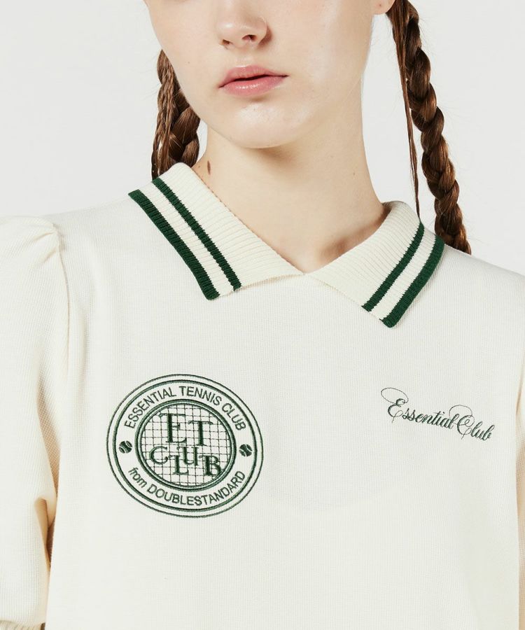 スポーツライクなポロシャツのデザインと、ガーリーなティアードスカートを組み合わせたワンピース。ゆったりと描くAラインが大人かわいいポイントで、前横後、どこから見てもシルエットが抜群です。袖はほんのりとパフスリーブ。バックはボタンデザインでひと手間をプラスし、デザイン性をアップ。ブランドらしい大人の遊び心が詰まった一着です。