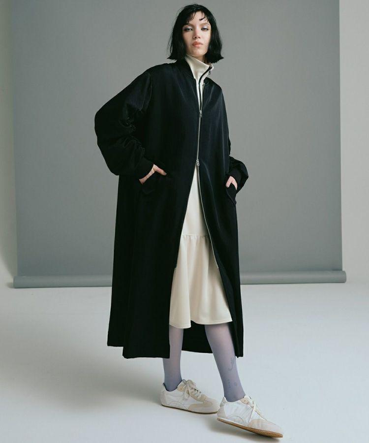 軽やかな光沢感のあるブライトキング素材を使用したジャージーワンピース。ボディの両脇にはリブを施し、抜け感を出しました。ショルダーのラインにはオリジナルのニットテープをあしらいアクセントに。ふんわりとしたスカートやAラインのシルエットも魅力で、スポーティーながらも大人フェミニンに着られるアイテムです。