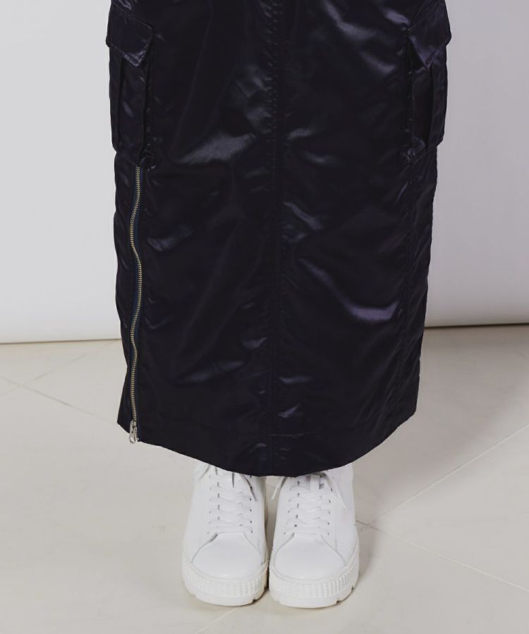 程良い厚みと柔らかさが特徴のナイロンツイル素材を使用したスカート。他にはないグロス感が印象的な、ハンサムなアイテムに仕上げました。ウエストはゴム仕様のためイージーな穿き心地なのもうれしいポイント。裾のファスナーを開けるとスリットとして楽しめ、ヒップ下にも隠しファスナーがあり、ミニスカートとしてアレンジできるようになっています。
