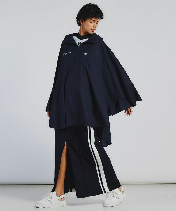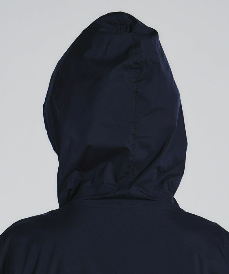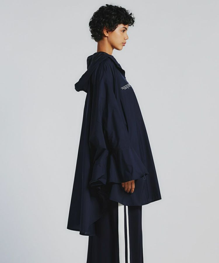 どんなコーディネートにも合わせやすい、ポンチョタイプのレインコート。スタイリッシュなデザインと軽やかな生地で、雨の日はもちろん、晴れの日にも着用できます。生地にはバイメタル構造のナイロン糸を使用しストレッチ性を出したタフタ素材を使用。ポリウレタンを使用しないことで液汚染を軽減し、防風・撥水性を実現しました。背中のポケットにたたんで収納可能なポケッタブル仕様。