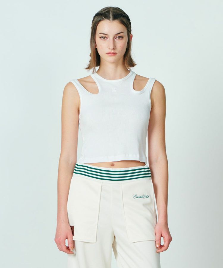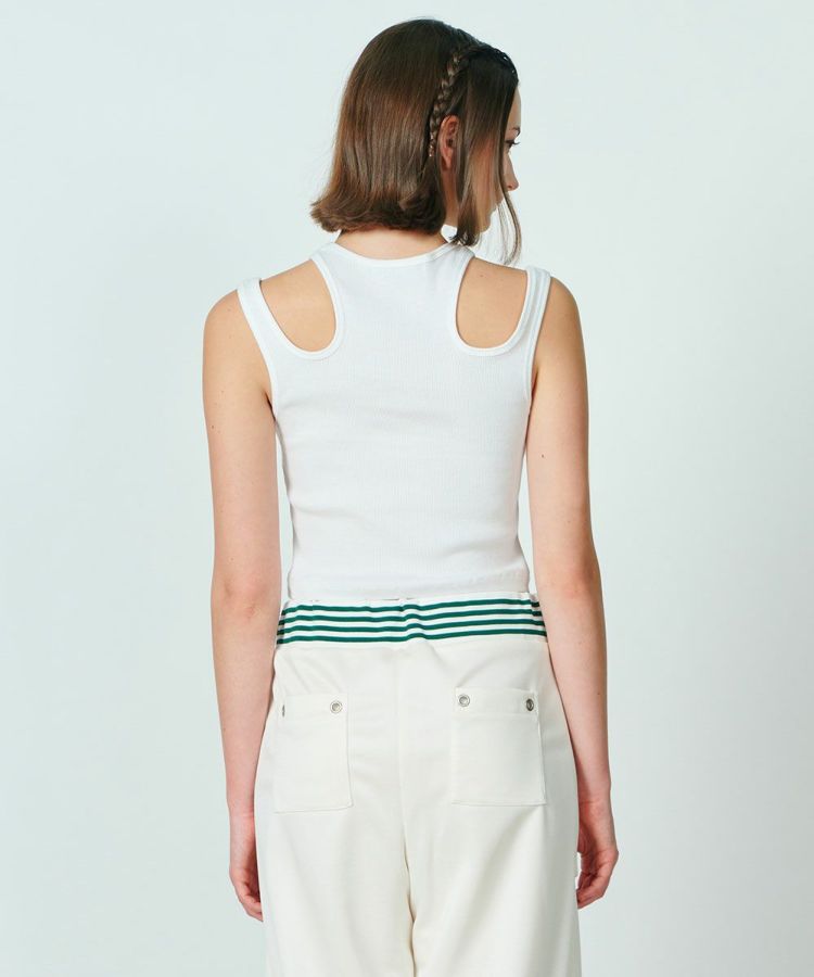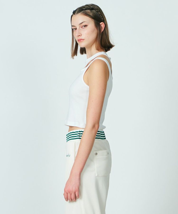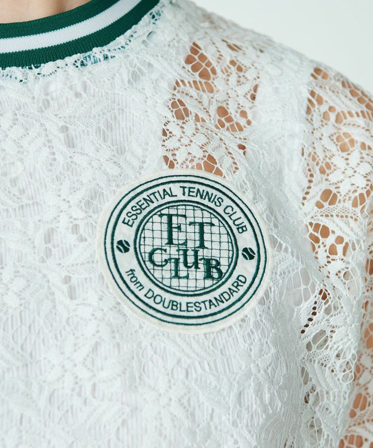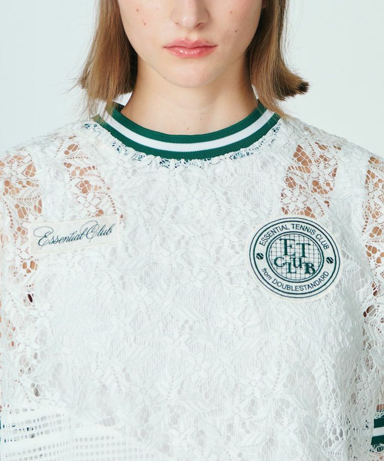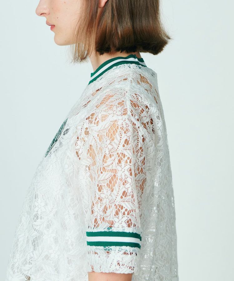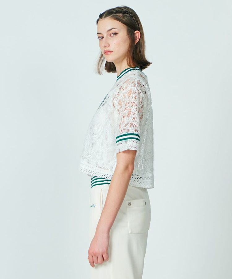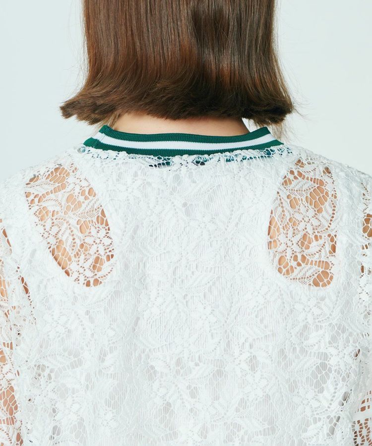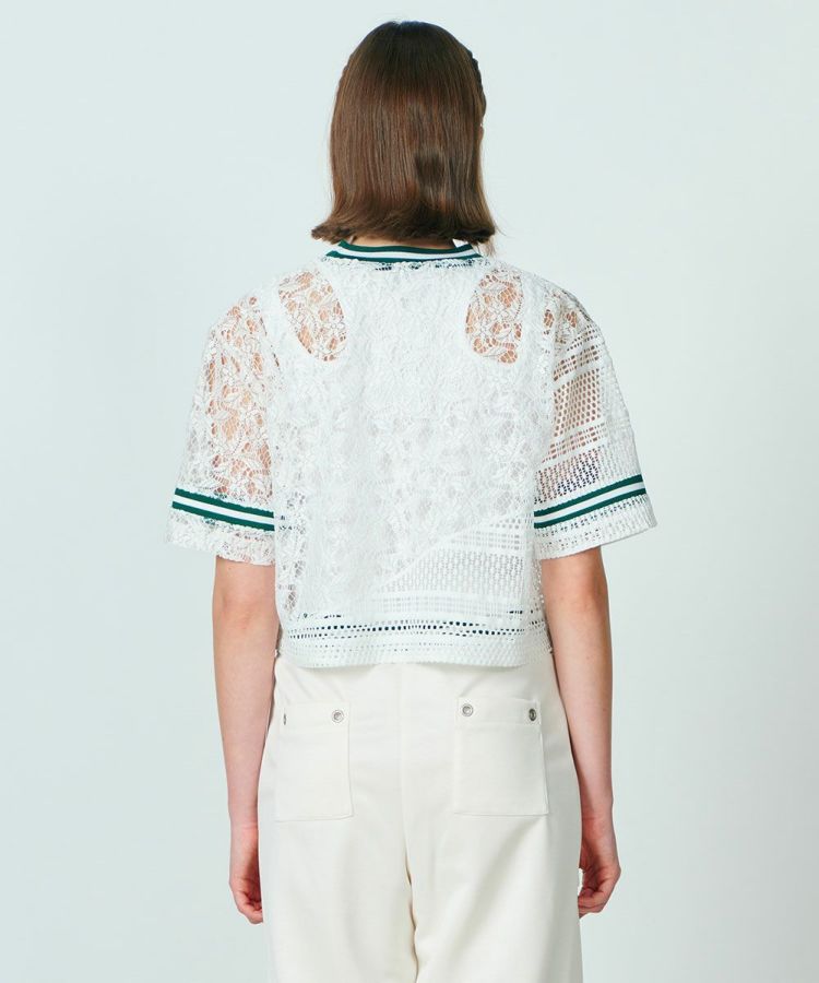 デコルテの左右にカットデザインを施したノースリーブトップスと、透け感のあるレースの半袖トップスをセットで楽しめるアイテム。それぞれ単体でも着映えするのがうれしいポイントです。アウターになるレースのトップスは、ラインデザインやエンブレムのディテールで、スクール×スポーツな雰囲気。今季らしいアイビールックにもぴったりです。