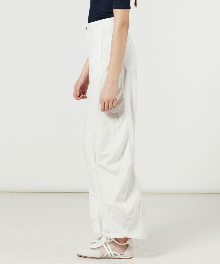 どこか懐かしさのある、バルーンシルエットがかわいいパンツ。タックとバックの絞りのギミックで立体的に仕上げることで野暮ったくならず、現代的に着用できるよう仕上げました。ハイウエストなのもポイントで、トップスをインしてもしなくても、コーディネート全体のシルエットにメリハリが出るのが魅力。ベーシックなカラーなので着まわし力も抜群です。
