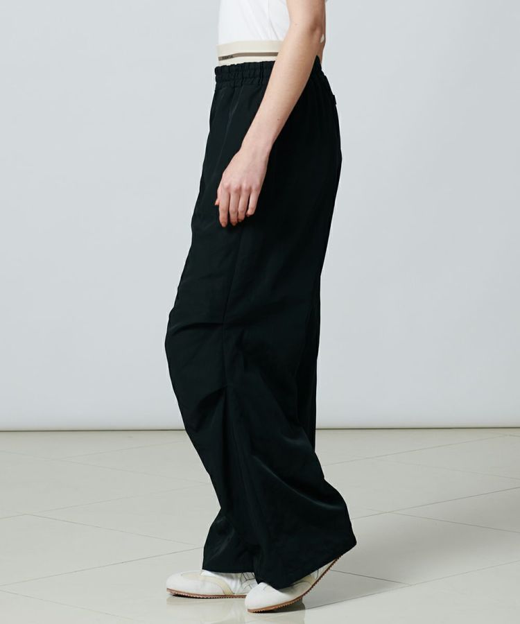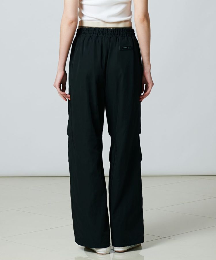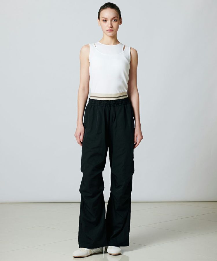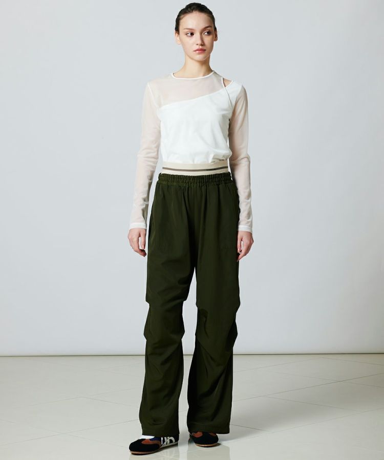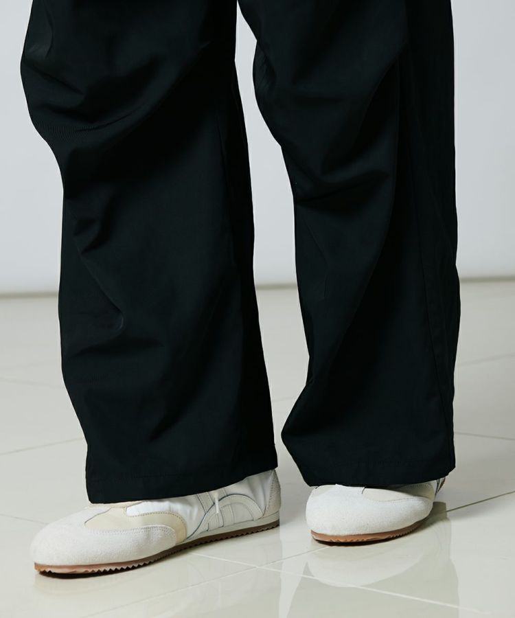 綾目がしっかりとした、表情感のあるツイル素材を使用したワイドパンツ。程よい肉感と落ち感があり、ハンサムなルックスに仕上げました。オリジナルのロゴを施したウエストゴムは、シンプルながらもロゴが際立つ大人っぽいデザインに。レイヤードしているようなディテールがコーディネートにアクセントをもたらし、イージーな穿き心地でありながらこなれ感の出るアイテムです。