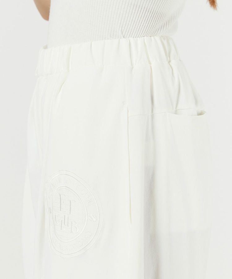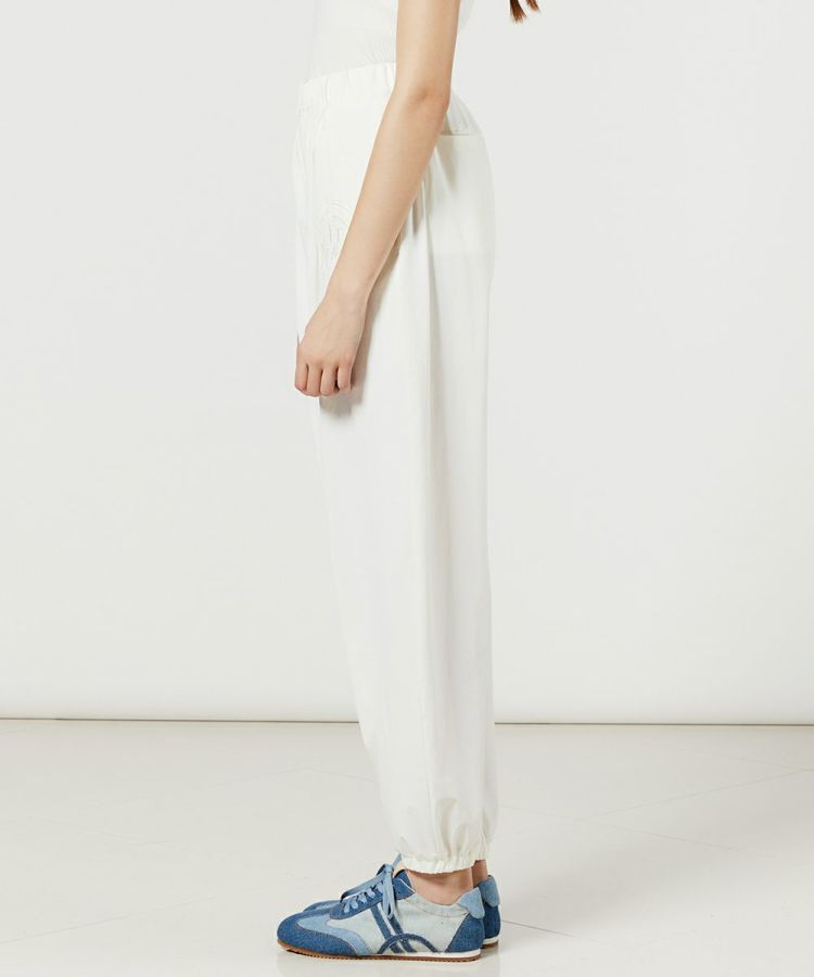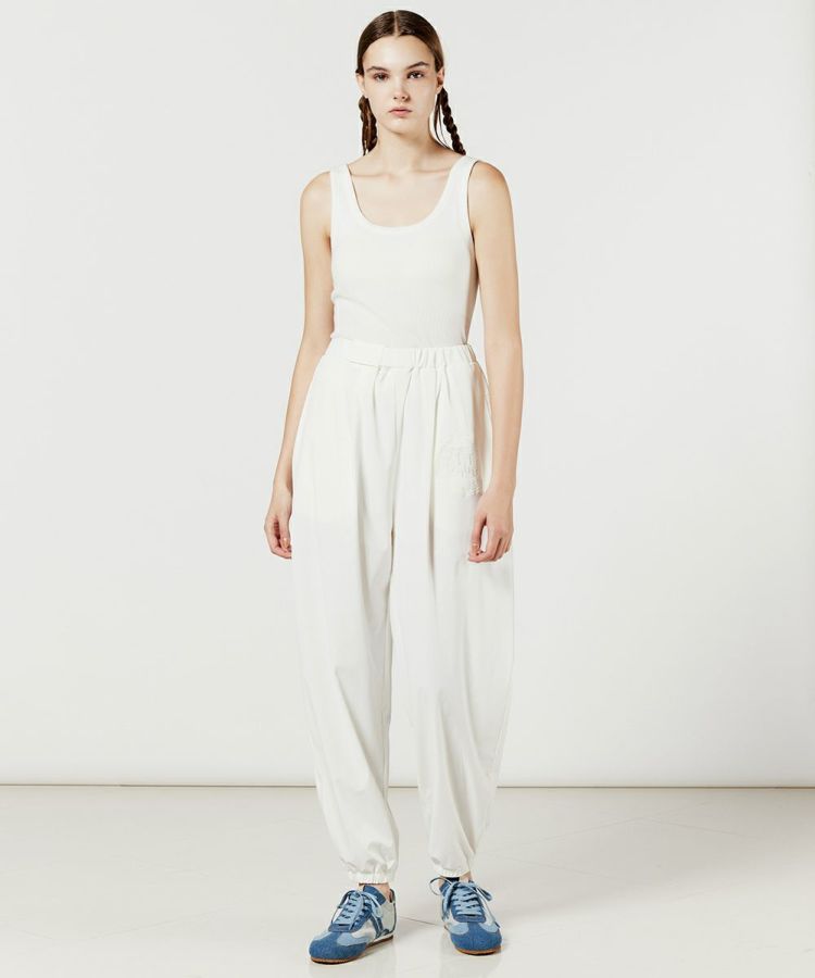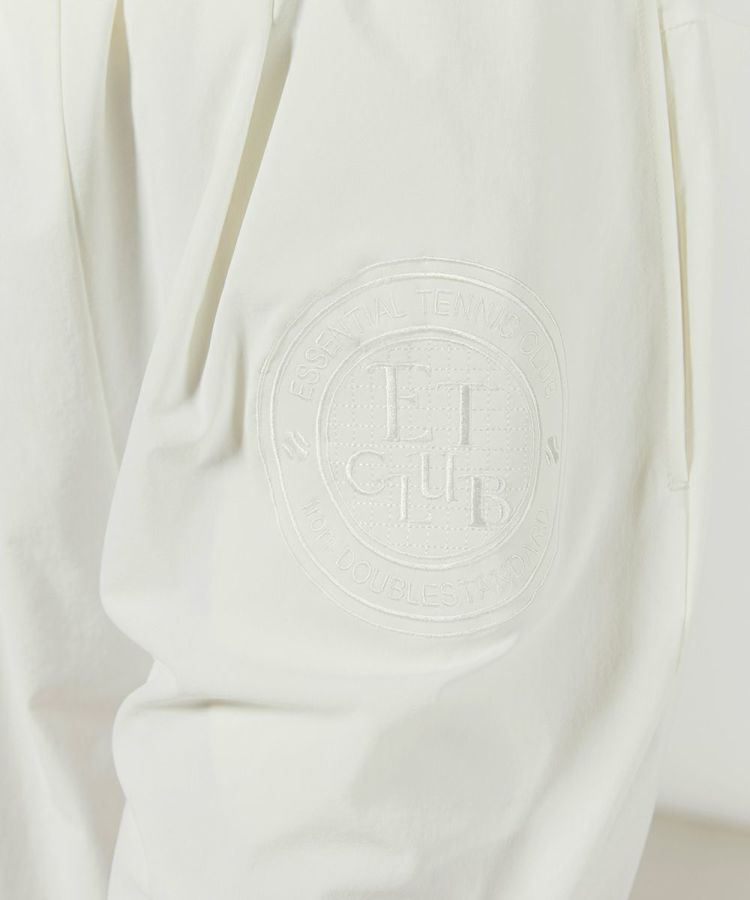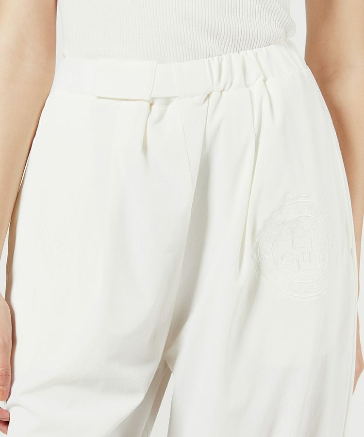 軽やかな着心地とルックスを兼ね備えた、ナイロン素材のパンツ。ストレッチ性と撥水性に優れており、機能性も抜群です。ウエストは高めに設定し、足元は絞りのデザインですっきりと穿きこなせるデザインに。同色の糸で施したオリジナルのエンブレムがさりげないアクセントになっています。