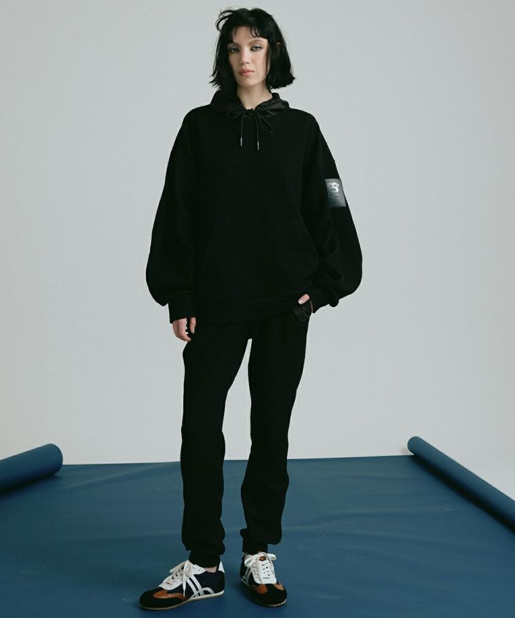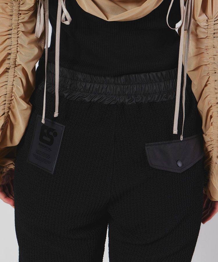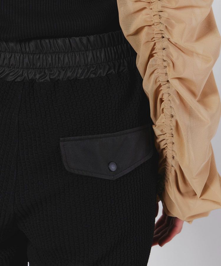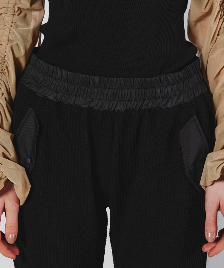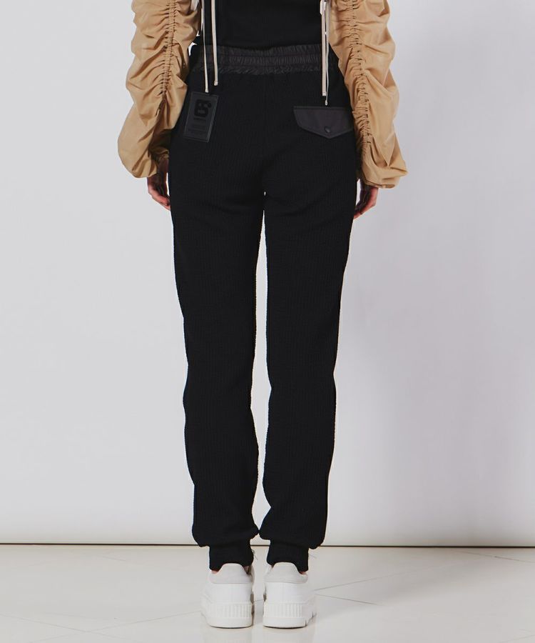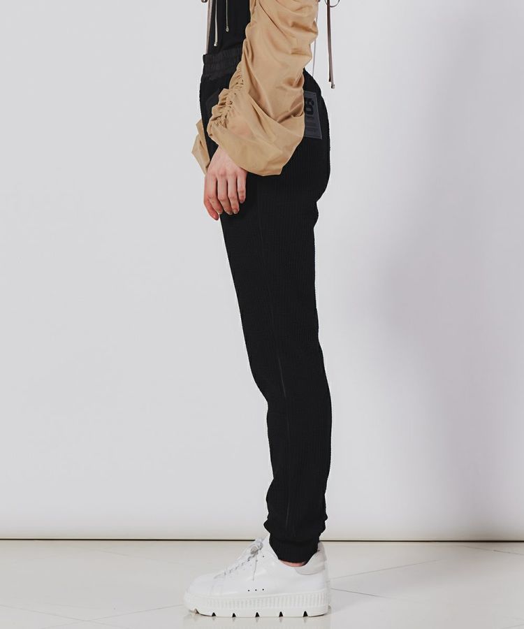穿き心地に優れたイージーパンツ。自然な質感でふくらみのあるポリエステル糸とポリウレタンをポリでカバーリングした伸縮性のある糸を編むことで、生地にストレッチ性を持たせています。全体的に縦畝なので、脚全体がすっきりと見えるのもうれしいポイント。サイドにはパイピングを挟み込み、デザインのアクセントをプラスするとともに、美脚シルエットを実現しています。