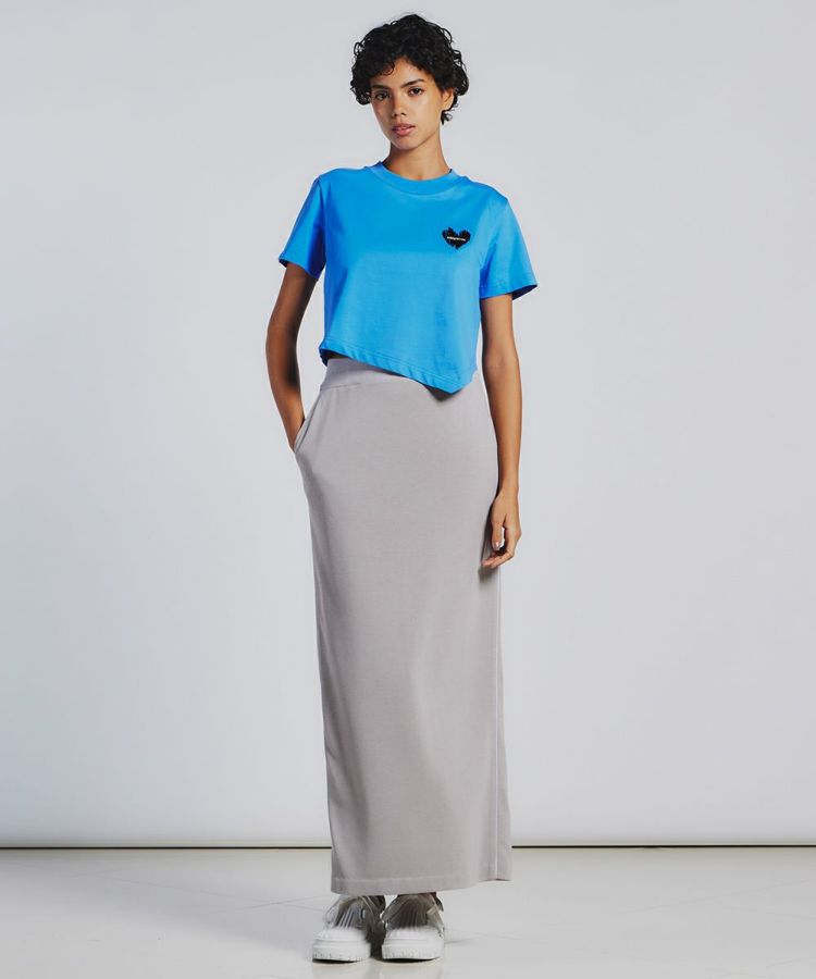 裾が変形デザインになったショート丈のTシャツ。コンパクトなフォルムがキュートで、手持ちのパンツやスカートに合わせるだけで大人カジュアルコーデが完成する一枚です。胸元のクラッシュハートの刺繍もアクセントに。バックスタイルにもメッセージをのせ、夏のアップヘアスタイルでもかわいく見えるのがうれしいポイントです。