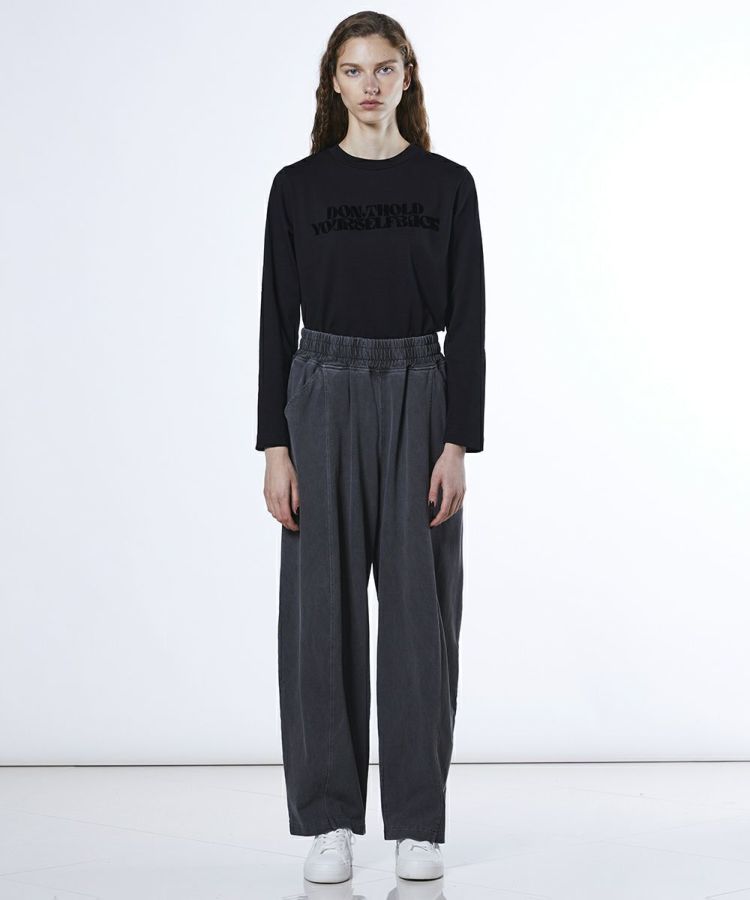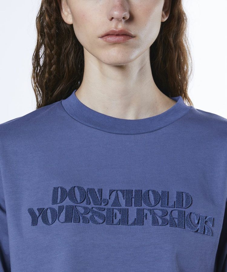 フロントのメッセージプリントが程よいアクセントになったロングTシャツ。裾をアシンメトリーに仕上げることで、シンプルながらもこなれ感のある一枚に仕上げました。カラーはコーデに馴染みやすいダスティーブルーと、着回し力の高いブラックの2色をご用意。ショート丈のデザインはロングスカートと好相性で、バランスの取れたスタイリングを叶えてくれます。