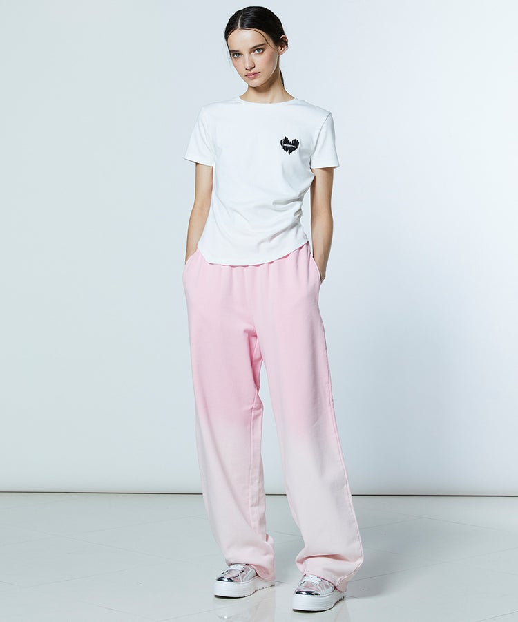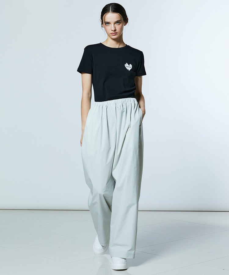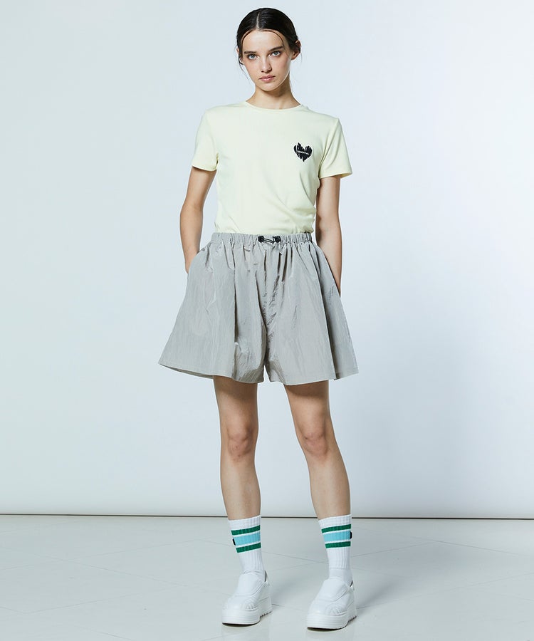 コンパクトなシルエットが、きれいめな印象を与えるTシャツ。サイドにさりげなくタックを施し、シンプルながらも立体感のあるデザインに仕上げました。胸元にはブラックハートのモチーフをあしらい、さりげなくアクセントをプラス。オフホワイト、イエロー、ブラックの3色展開で、ボトムスやスタイリングに合わせてカラーを選べるのも魅力です。