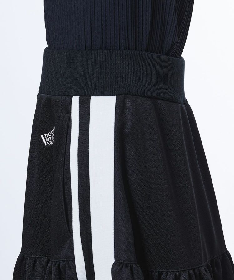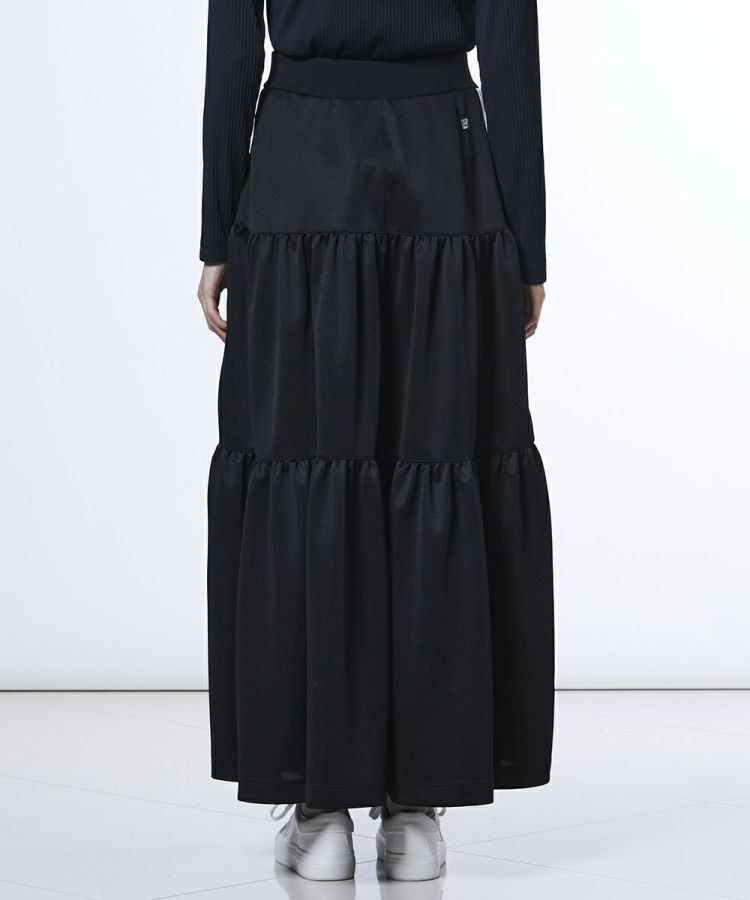 トラックジャージのディテールを取り入れたロングスカート。ボリュームのあるティアードデザインが、スポーティーな中にも女性らしい華やかさを添えてくれます。ポリエステルのジャージ素材を使用し、吸汗性・速乾性に優れた快適な着心地を実現。コンパクトなトップスを合わせれば、バランスの取れたスタイリッシュなコーディネートが完成します。