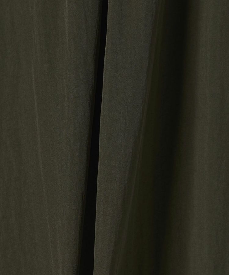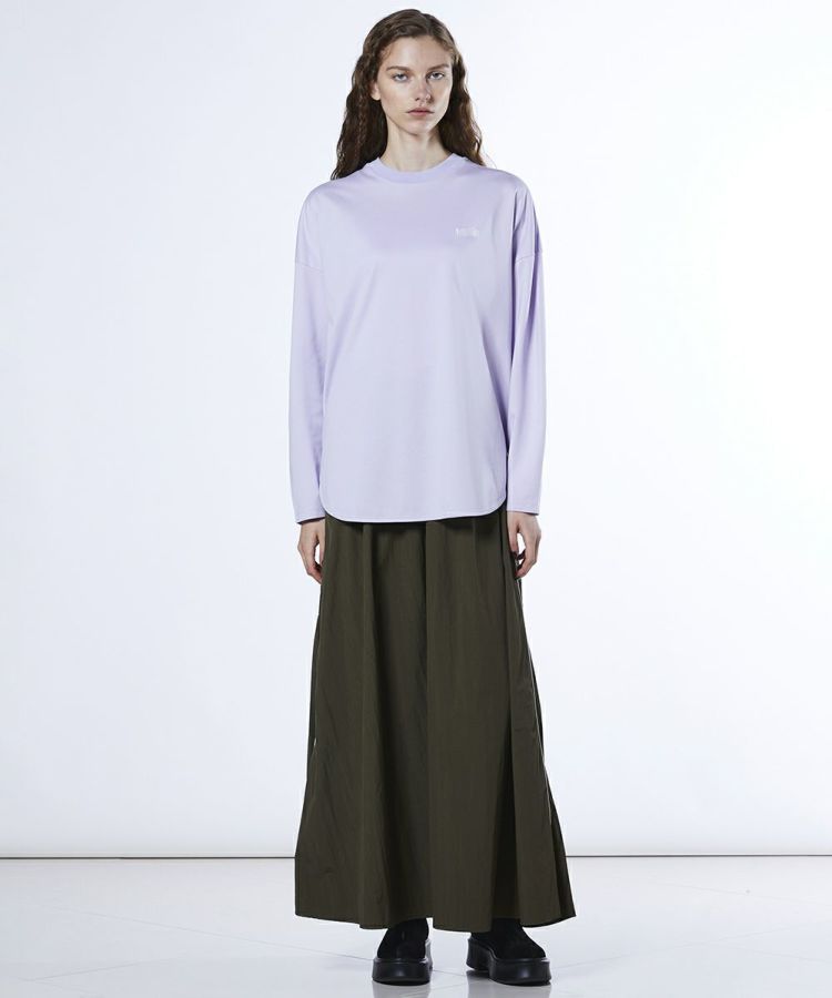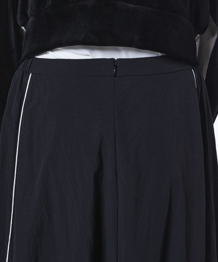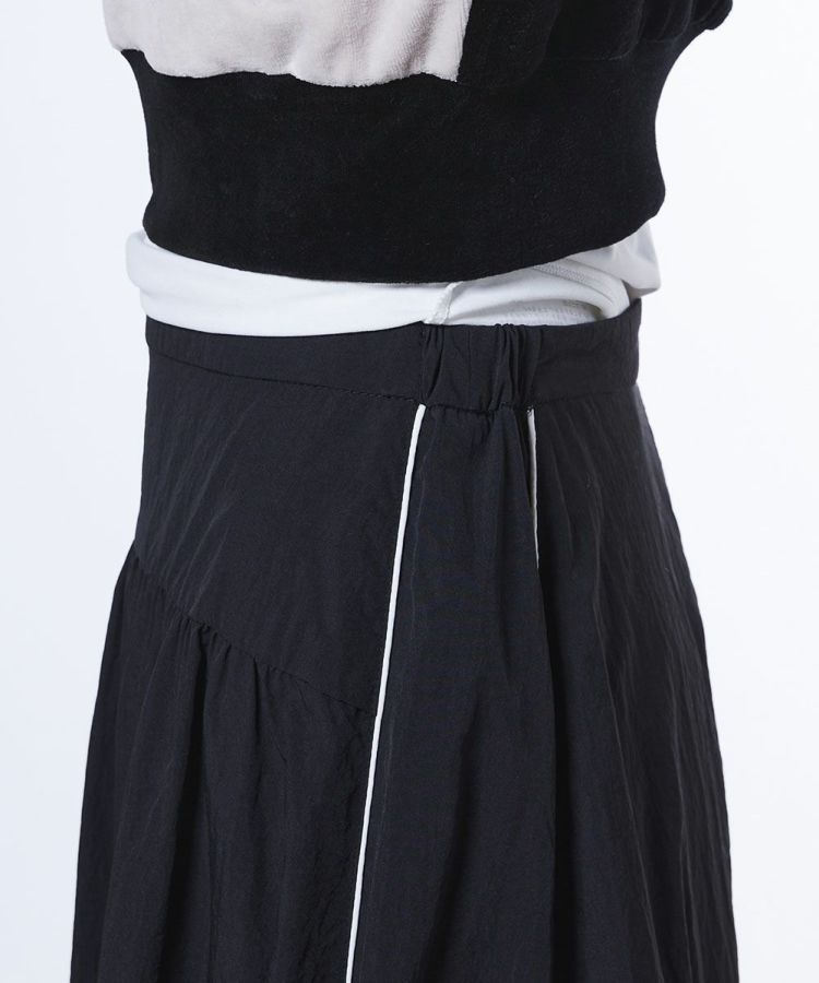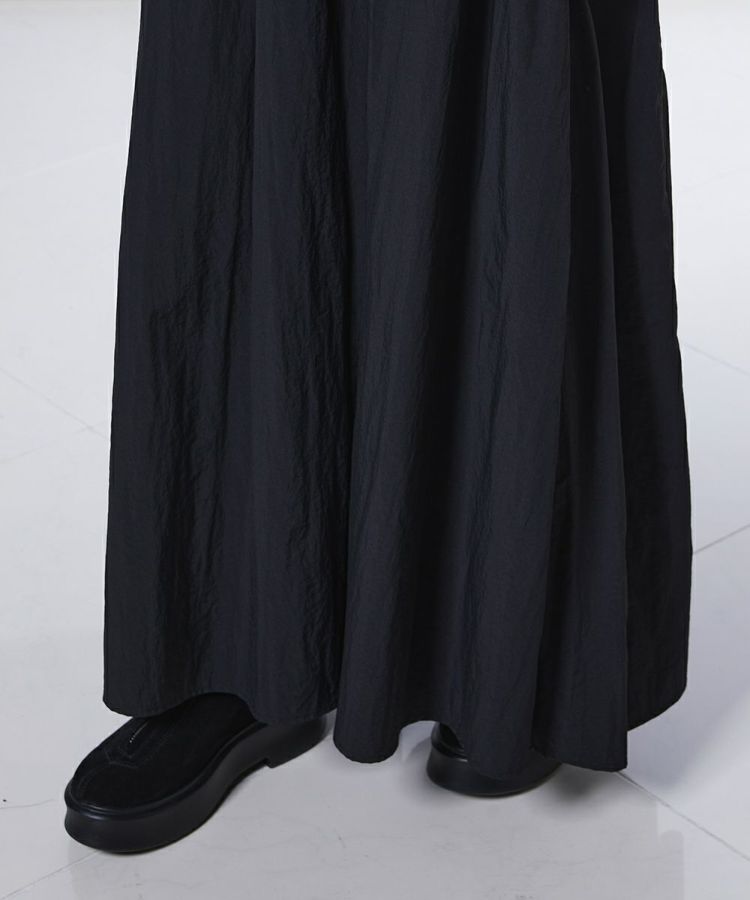 光沢感と美しいドレープが際立つナイロンタフタ素材を用いたスカート。軽やかで耐久性・撥水性にも優れ、機能性とファッション性を兼ね備えました。スポーティーな素材感でありながら、裾に向かって広がるフレアシルエットが女性らしさを引き立て、コーディネートに華やぎをプラス。ショート丈のトップスを合わせればバランス良くスタイリングが決まります。