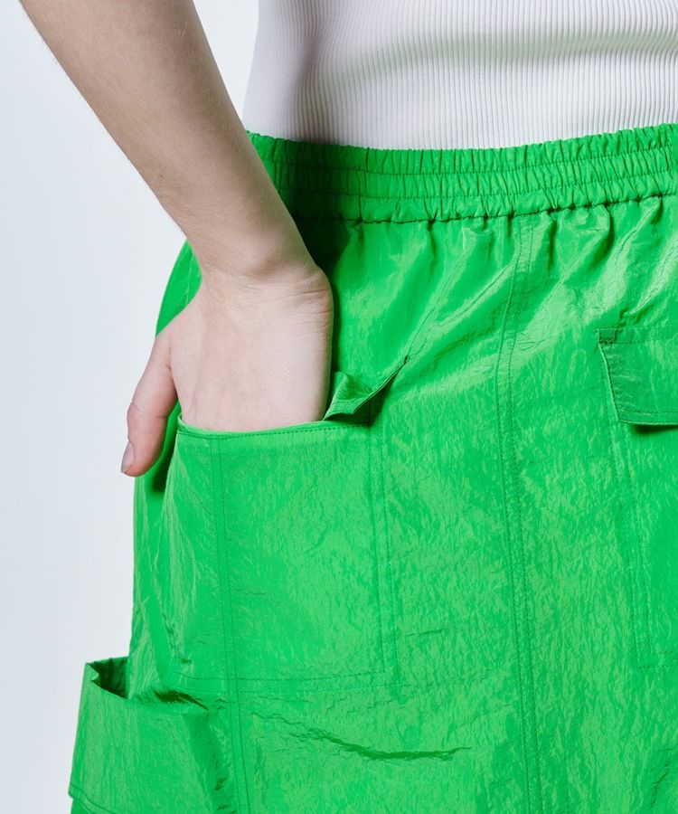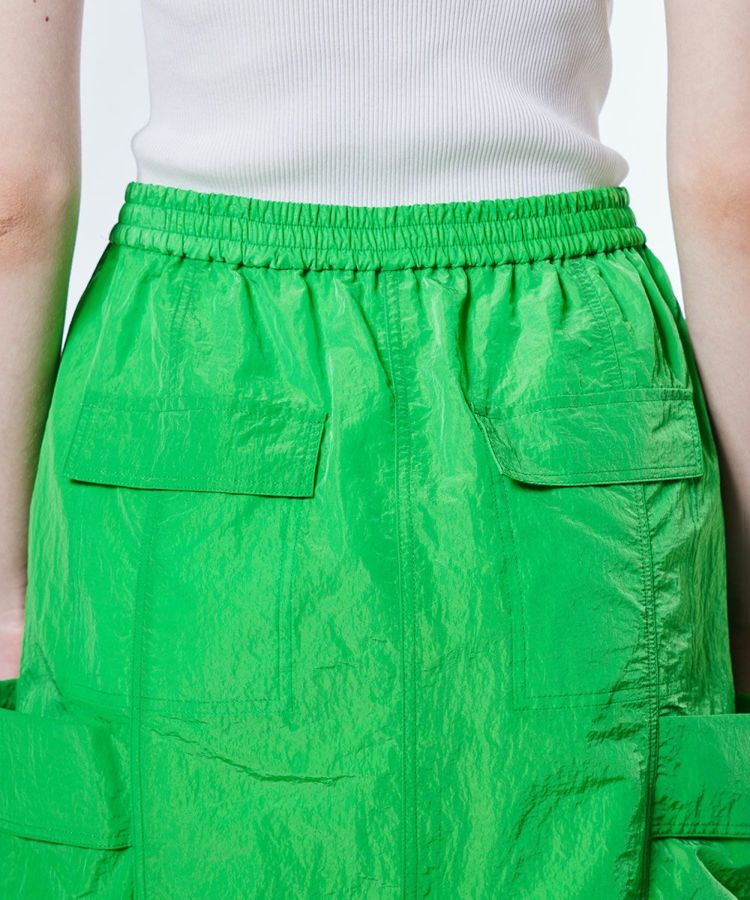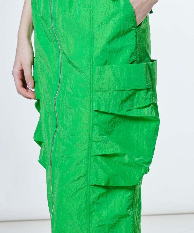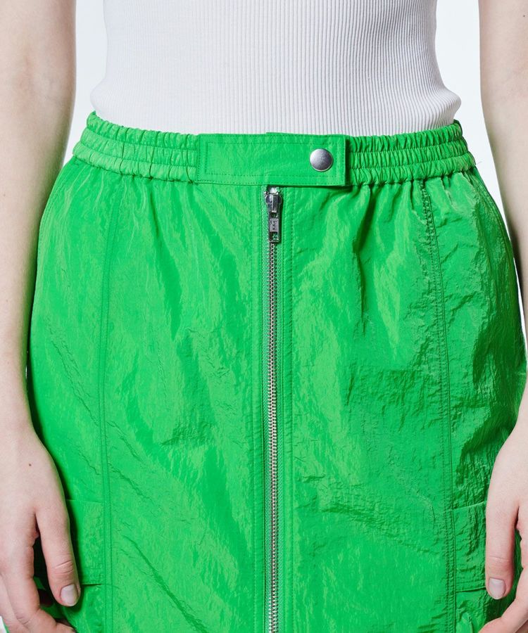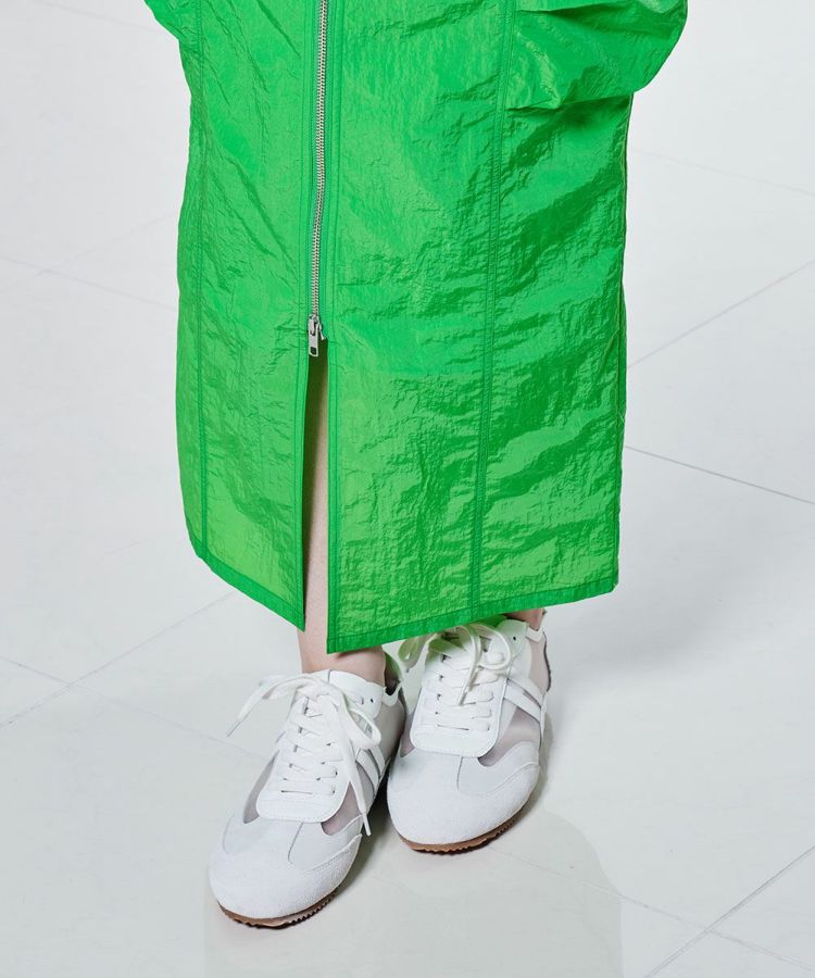 ほのかにグロス感のあるタフタ生地を使用した、ロングスカート。フロントはジップ仕様で、お好みの位置に調節してスリットとしても楽しめます。カラーは鮮やかなグリーンとシックなブラックの2色展開。同素材のジャケット(型番:2505080252)とセットアップで合わせると、よりスポーティーな雰囲気で着こなせます。