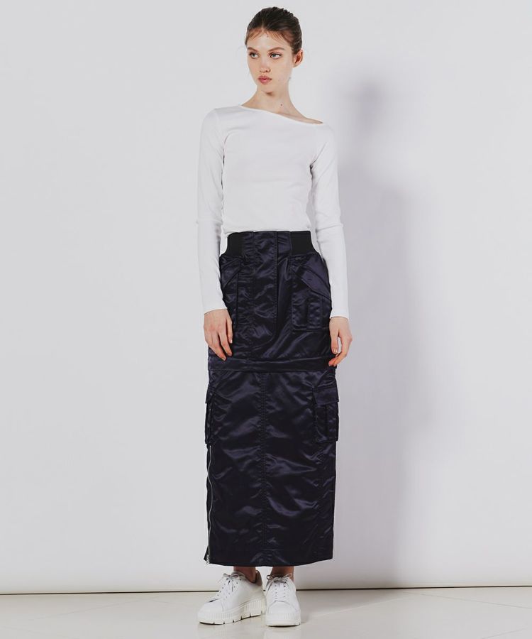 程良い厚みと柔らかさが特徴のナイロンツイル素材を使用したスカート。他にはないグロス感が印象的な、ハンサムなアイテムに仕上げました。ウエストはゴム仕様のためイージーな穿き心地なのもうれしいポイント。裾のファスナーを開けるとスリットとして楽しめ、ヒップ下にも隠しファスナーがあり、ミニスカートとしてアレンジできるようになっています。