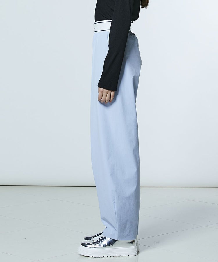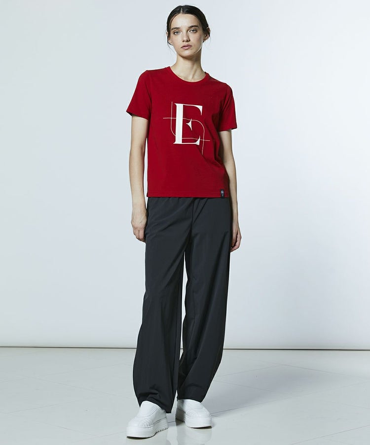 ウエストにあしらったロゴ入りゴムが、さりげないアクセントになるパンツ。裾に向かって緩やかにカーブするシルエットで、ヒップや太ももを自然にカバーしながら、女性らしい丸みと軽やかさを演出します。タックインして着用すればよりスポーティーな印象に。同素材のキャミソール(型番:2504170261)と合わせた、セットアップスタイルもおすすめです。