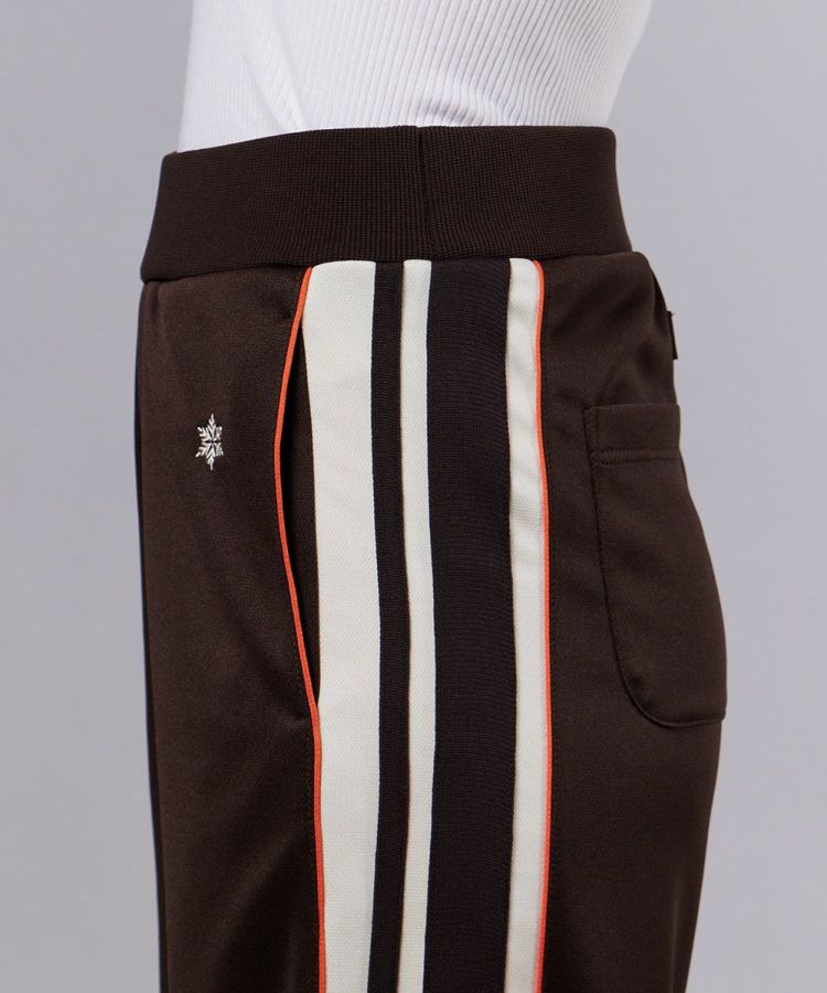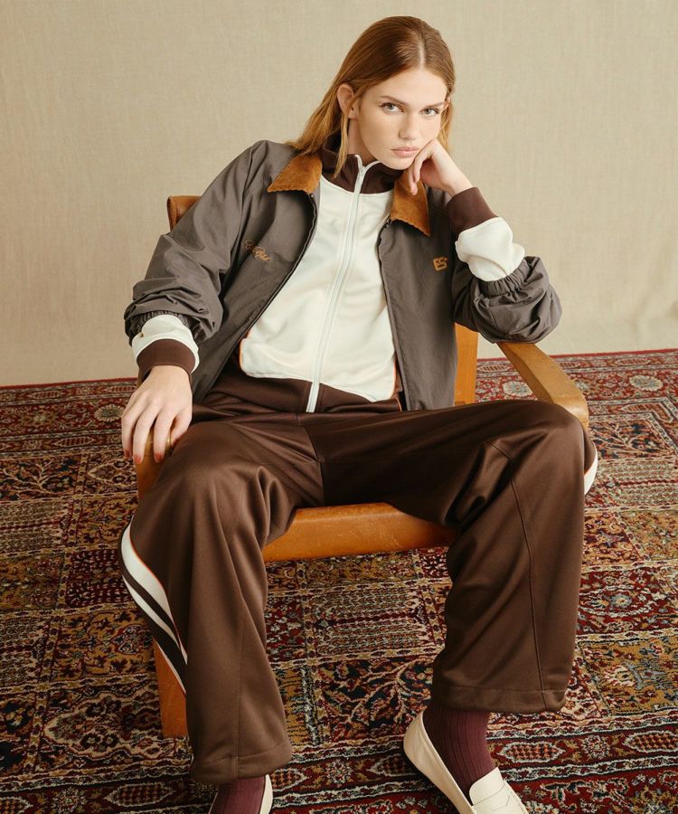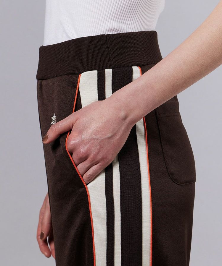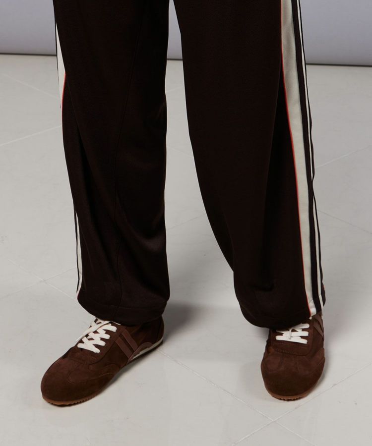 すっきりとしたストレートシルエットで、デイリーに活躍するトラックパンツ。吸汗・速乾性に優れたポリエステルジャージ素材を使用し、軽やかで快適な着心地を実現しました。落ち着いたブラウンカラーに映える、オレンジのパイピングコードが程よいアクセントとなり、スポーティーながらも洗練された印象に。同素材のトラックジャケット(型番:2505270253)と合わせれば、今の気分にぴったりなセットアップスタイルが完成します。