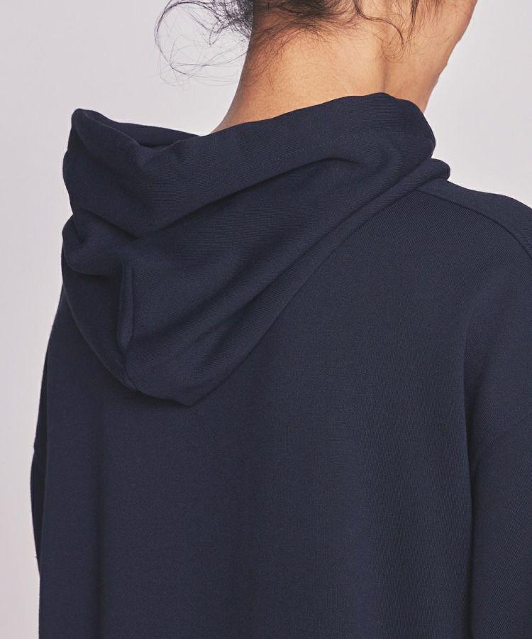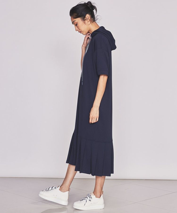 スポーティーでありながらきれいめな印象のパーカーワンピース。リサイクルポリエステル糸を使用したサステナブル素材で、綿のような風合いがありながらも、吸水速乾性と形態安定性に優れています。夏場に楽チンな着心地でイージーケアなのが魅力的。ポリエステルの裏毛の性質を活かした裾のプリーツ加工もポイントで、歩くたびに裾が揺れるのがかわいい。オリジナルのスピンドルがスクエアタイプなのもこだわりです。