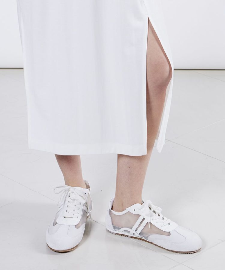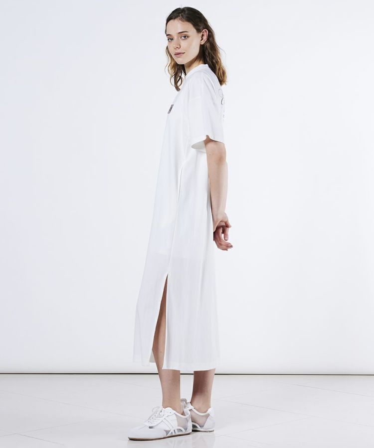 暑い季節でも軽やかに着こなせるラフなワンピース。背中のロゴプリントが、スポーツライクなアクセントになっています。高ストレッチ性を備えた素材を使用しているため、長時間着用しても着心地も楽ちん。程よい透け感と深めのスリットが、さりげない女性らしさを演出してくれます。1枚でサマになるワンピースは、何枚あっても重宝すること間違いなし。