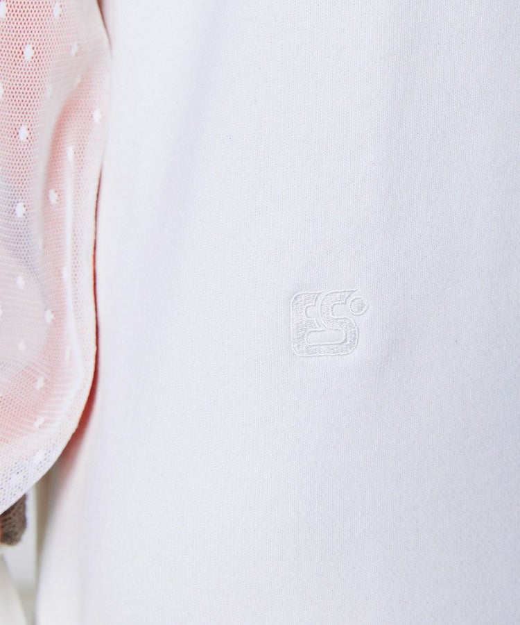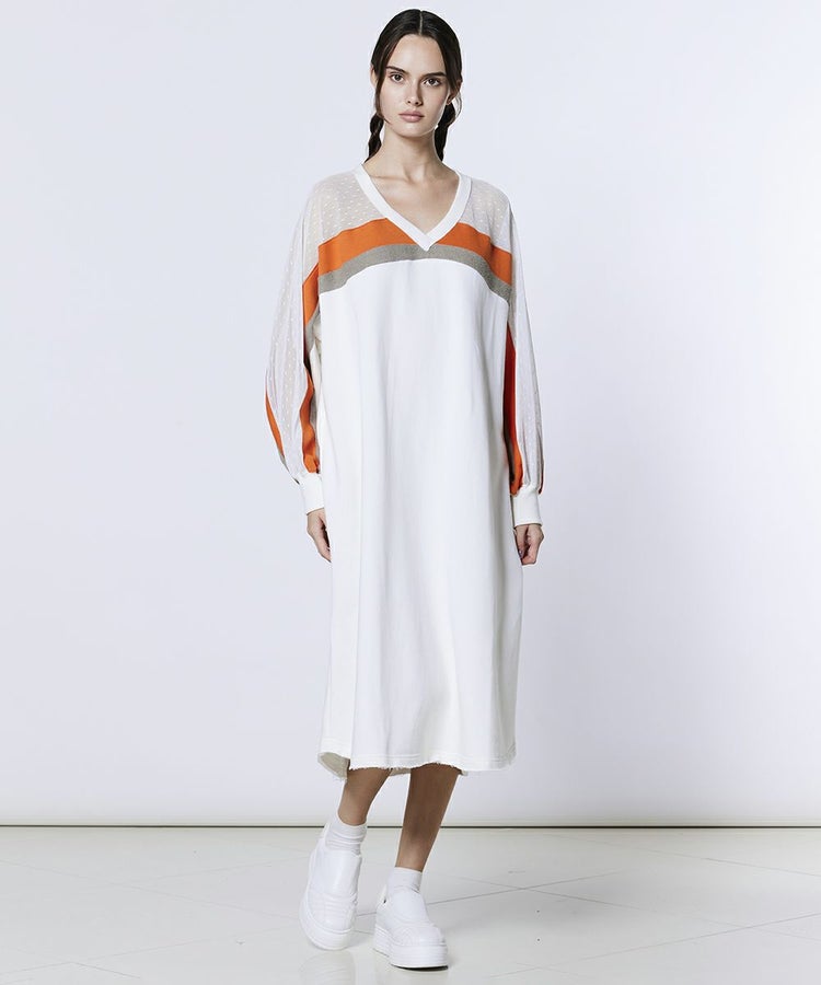 スポーティーなスタイリングを楽しめるワンピース。Vネックデザインがデコルテラインをすっきりと美しく演出します。肩から腕にかけては、透け感のあるドットチュールをあしらい、ヘルシーな肌見せをプラス。着るだけでスタイリングが決まる一枚は、ワードローブに加えておくと幅広いシーンで活躍するアイテムです。