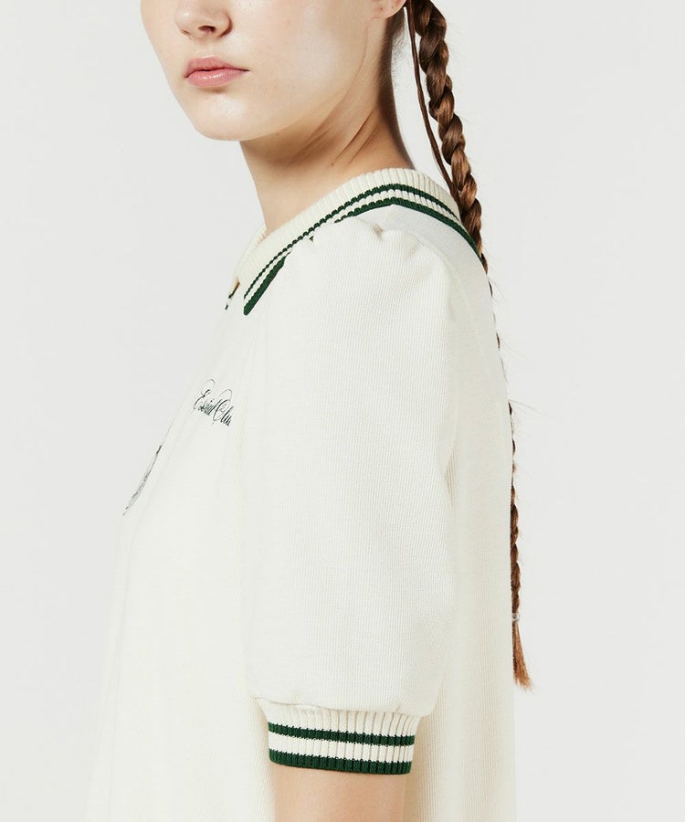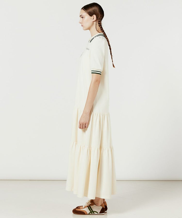 スポーツライクなポロシャツのデザインと、ガーリーなティアードスカートを組み合わせたワンピース。ゆったりと描くAラインが大人かわいいポイントで、前横後、どこから見てもシルエットが抜群です。袖はほんのりとパフスリーブ。バックはボタンデザインでひと手間をプラスし、デザイン性をアップ。ブランドらしい大人の遊び心が詰まった一着です。
