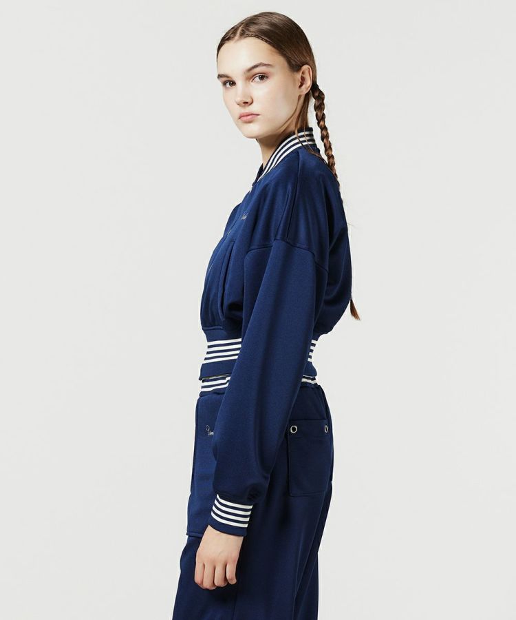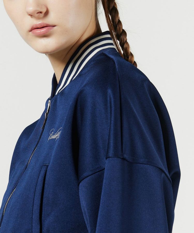 今季らしいアイビールックに取り入れたい、“ダサかわいい”ジャージ素材のブルゾン。どこかレトロなデザインを、スーパーショート丈で現代的に、ファッショナブルに仕上げました。ウエストのデザインはスリーラインがアクセントになり、スタイルアップ効果抜群。ジップや背中に施したこだわりのロゴパッチのディテールがさりげない高級感を出してくれます。