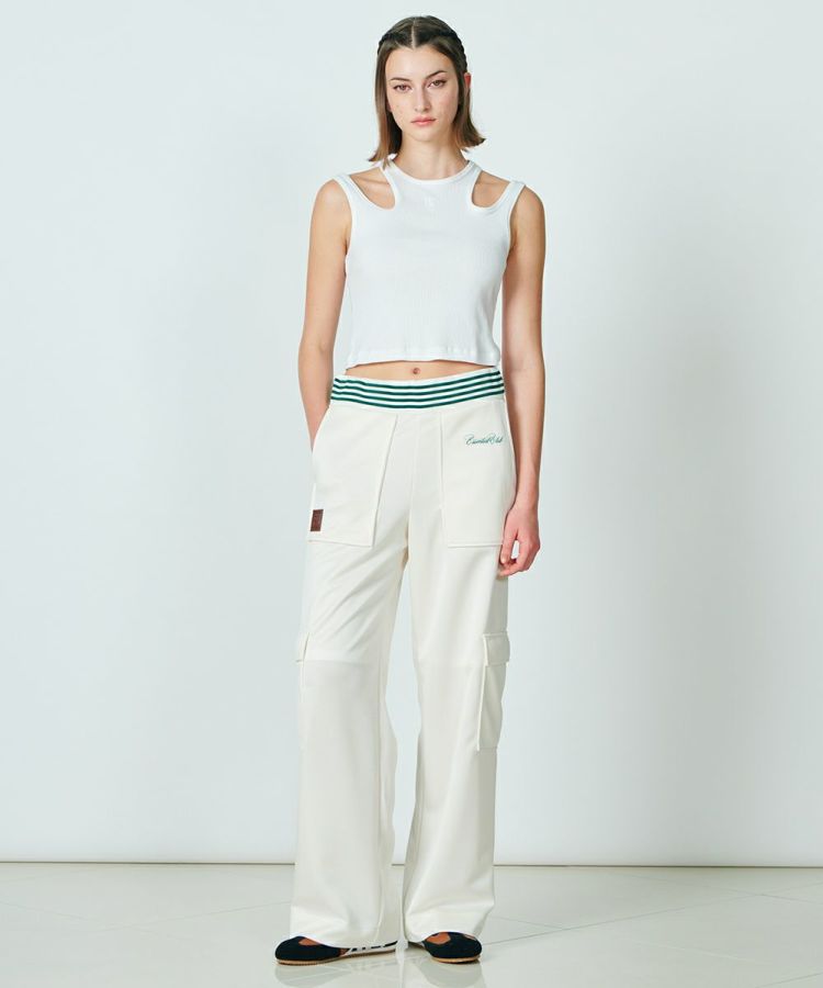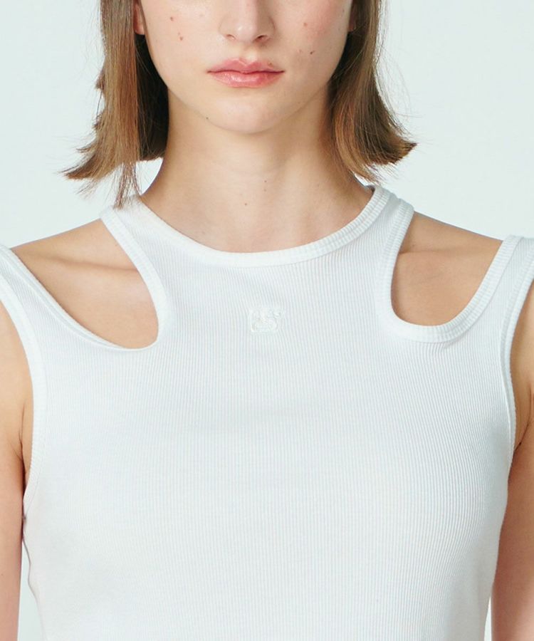 デコルテの左右にカットデザインを施したノースリーブトップスと、透け感のあるレースの半袖トップスをセットで楽しめるアイテム。それぞれ単体でも着映えするのがうれしいポイントです。アウターになるレースのトップスは、ラインデザインやエンブレムのディテールで、スクール×スポーツな雰囲気。今季らしいアイビールックにもぴったりです。