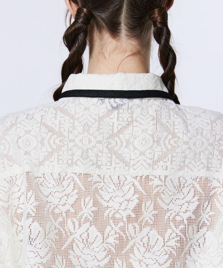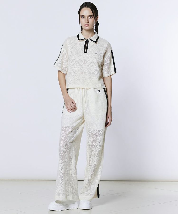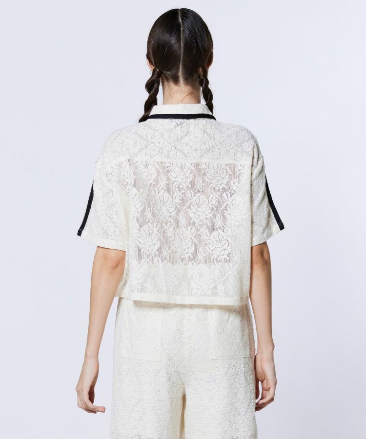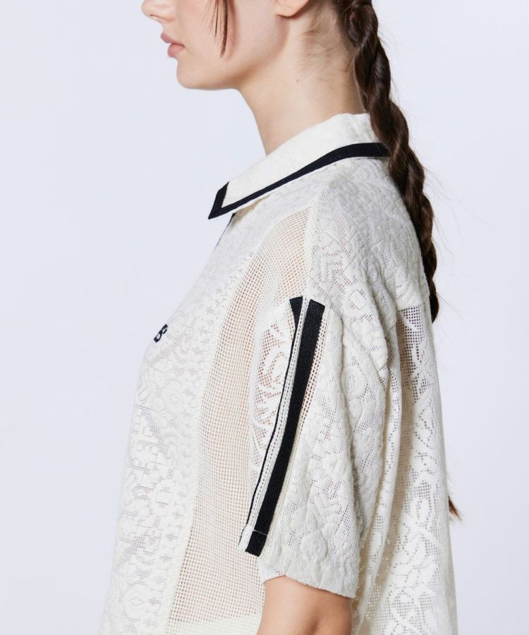 全面にクラシカルな柄のレースをあしらった、フェミニンな印象のトップス。程よい透け感のあるレース素材が、ヘルシーで女性らしい肌見せを演出します。襟付きデザインで、スポーティーな要素の中に上品さをプラス。同素材のパンツ(型番:2506271261)と合わせれば、大人フェミニンなスポーツテイストのセットアップスタイルを楽しめます。