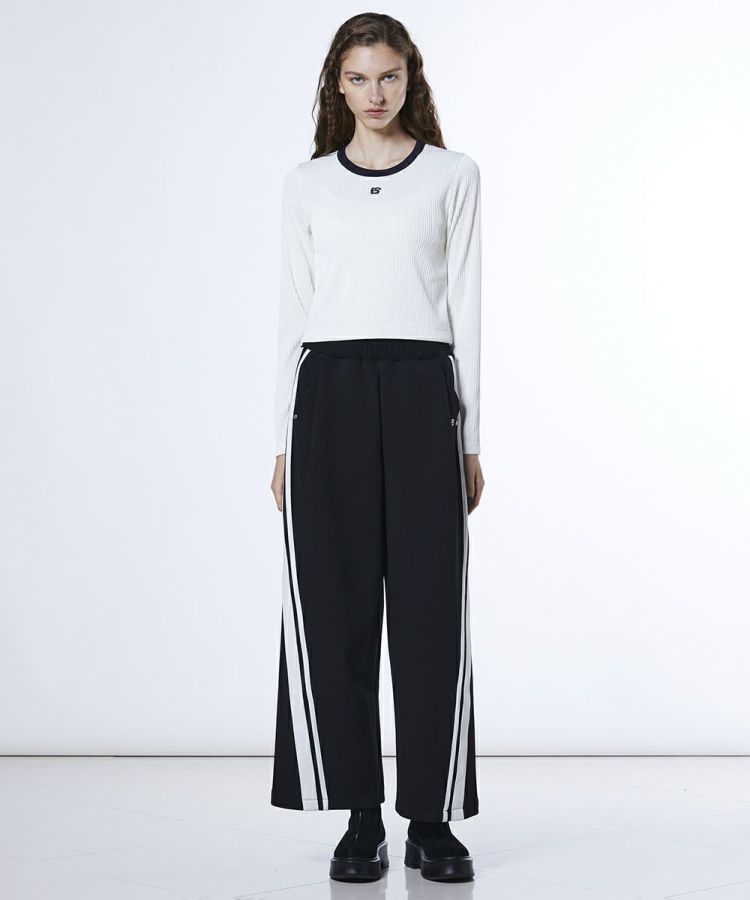 シンプルなデザインながらも凹凸感のある生地が程よいアクセントを添えるトップス。フロントにはさりげなくブランドロゴをあしらい、上品さと遊び心をプラスしました。カラーはオフ×ブラックの2種類のバイカラーで展開。どんなボトムスとも相性がよく、合わせるアイテム次第でカジュアルにもシックにも表情を変えられる、着回し力抜群の一枚です。