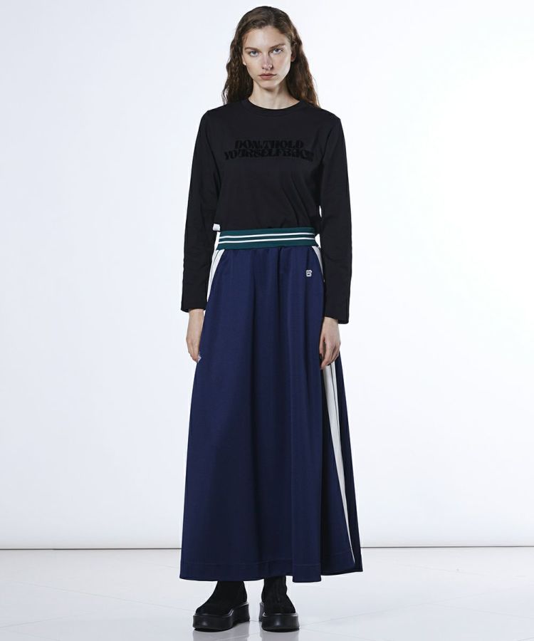 フロントのメッセージプリントが程よいアクセントになったロングTシャツ。裾をアシンメトリーに仕上げることで、シンプルながらもこなれ感のある一枚に仕上げました。カラーはコーデに馴染みやすいダスティーブルーと、着回し力の高いブラックの2色をご用意。ショート丈のデザインはロングスカートと好相性で、バランスの取れたスタイリングを叶えてくれます。