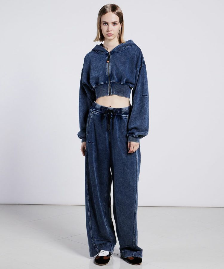 インパクトのある加工が目を引くパーカー。しっかりとした裏毛素材をインディゴ染めし、あえてムラバイオウォッシュ加工を施しました。ショート丈×ボリューム袖のシルエットが、コーディネートにエッジをプラス。また、スタイルアップを叶えてくれます。加工生地の程よい落ち感があるため、ヴィンテージのような風合いと大人っぽいこなれ感を演出してくれるのも魅力です。