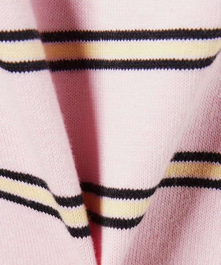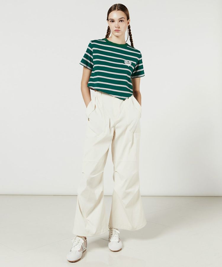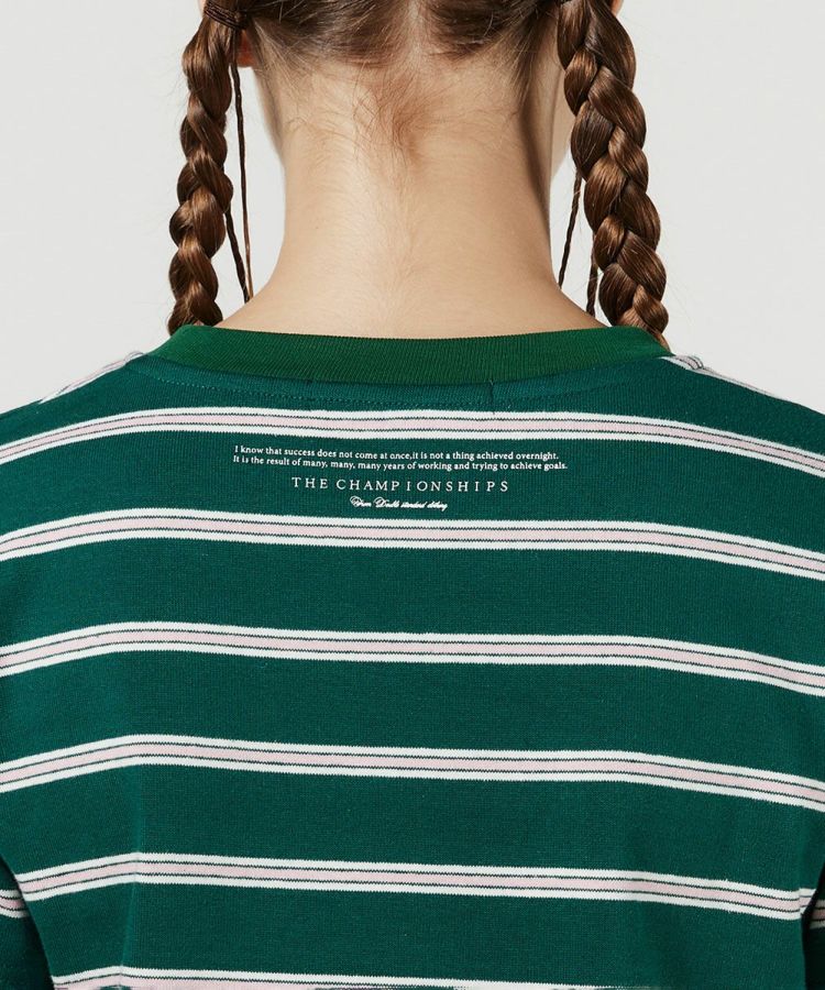 ノスタルジックな配色がかわいい、ボーダー柄のTシャツ。コンパクトなシルエットに加え、アシンメトリーな裾のデザインがワンポイントになっています。どんなボトムと合わせてもバランスが決まりやすいのもうれしいポイント。柔らかな天竺素材で、着心地も快適です。