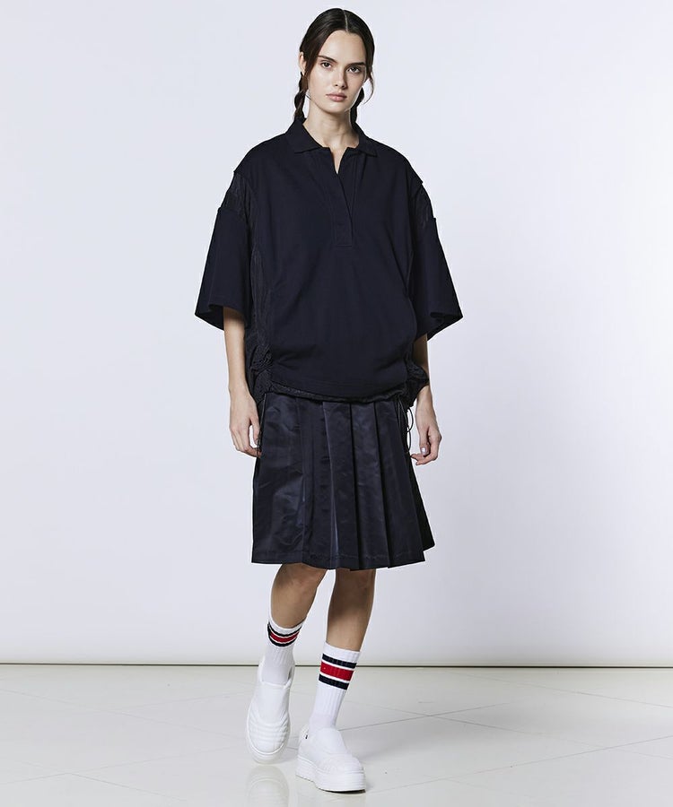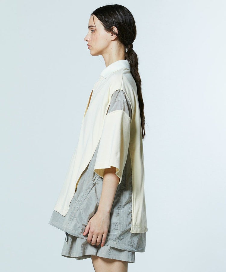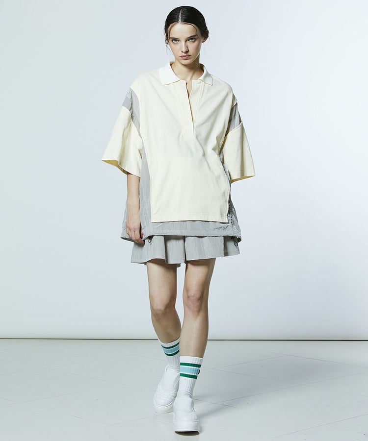 ナイロンブルゾンとポロシャツをドッキングしたようなデザインが魅力的なトップス。異素材の組み合わせがアクセントになり、着るだけでスタイリングに存在感をプラスします。ボリューム感のあるオーバーシルエットが、リラクシンなムードを演出。ベージュとオールブラックの2色展開で、同素材のキュロットパンツ(型番:2506221261)と合わせれば、レトロフェミニンなスポーティースタイルが完成します。
