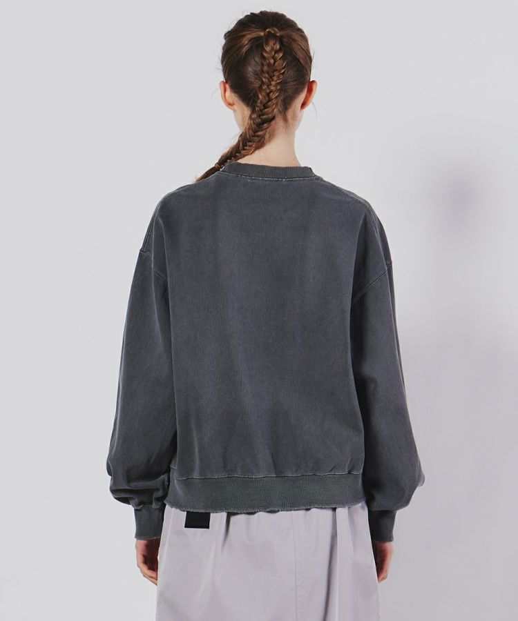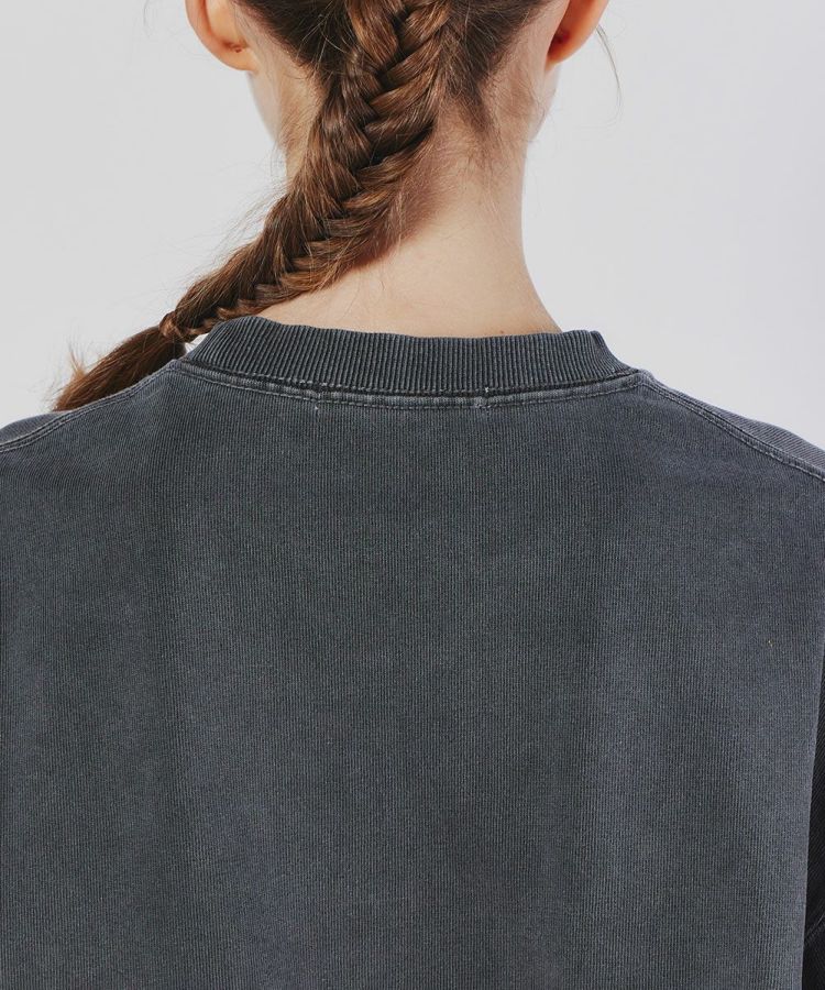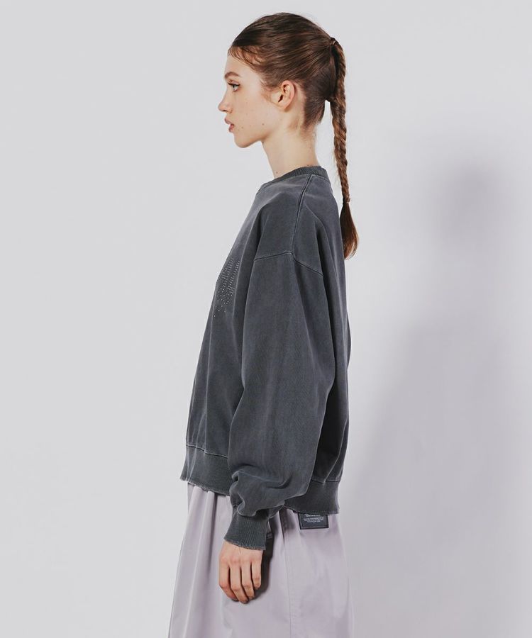 零れ落ちるようなロゴを同色のラインストーンであしらったスウェットトップス。カジュアルな素材感とアートなデザインのコントラストが魅力になっています。生地にはしっかりとした厚さがありつつも、通気性・吸湿性に優れたコットン天竺素材を使用。洗濯耐性が強く、ガシガシと洗えるのがうれしいポイントです。ピグメント加工を施し洗うたび表情が変わるため、風合いが楽しめる一枚。