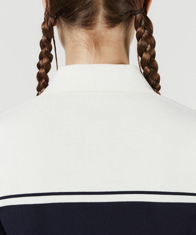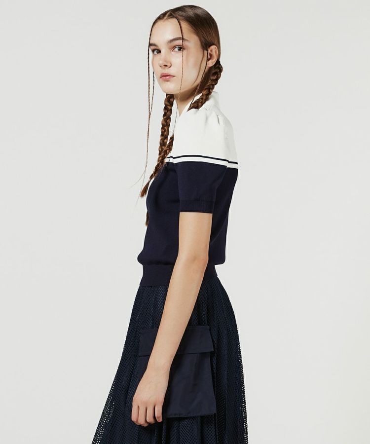 バイカラーがレトロかわいいニットポロシャツ。パフスリーブが腕のラインをきれいに演出し、フェミニンな印象を与えてくれます。コンパクトなフォルムもポイントで、ボトムとのバランスを取りやすくスタイルアップ’を狙えるのがうれしい。大人かわいいスポーツMIXコーデに取り入れたい一枚です。