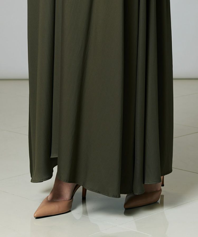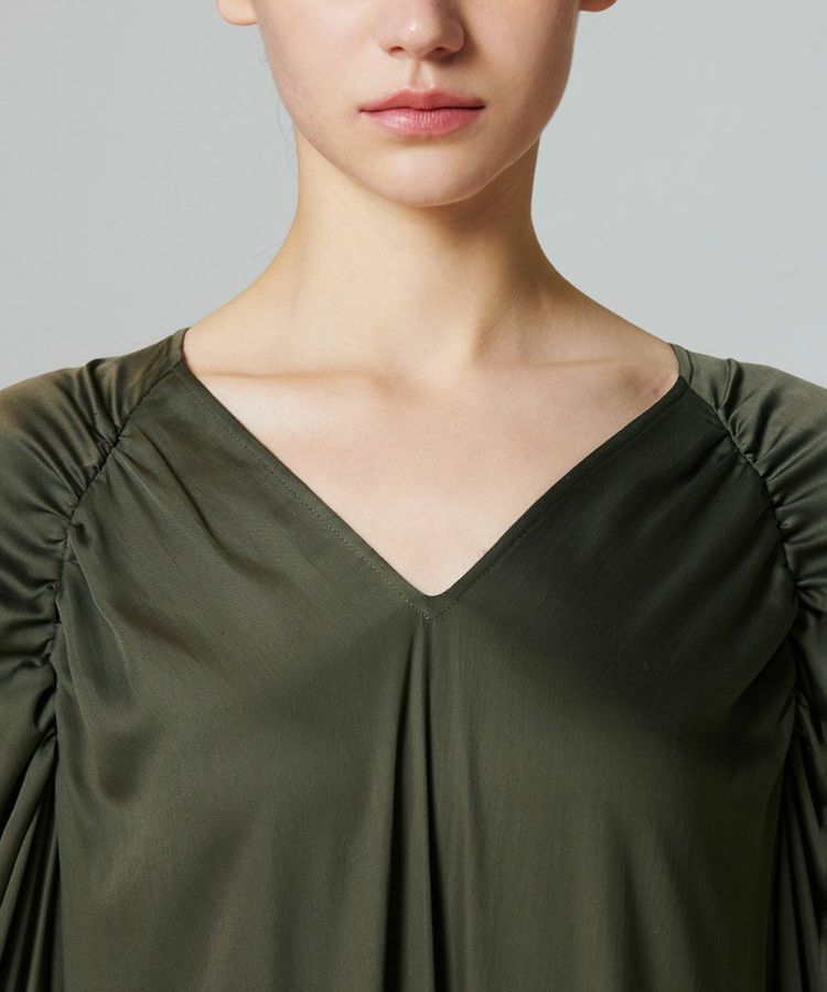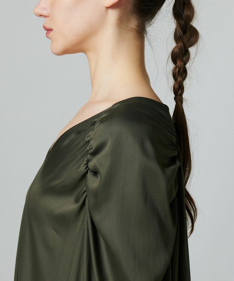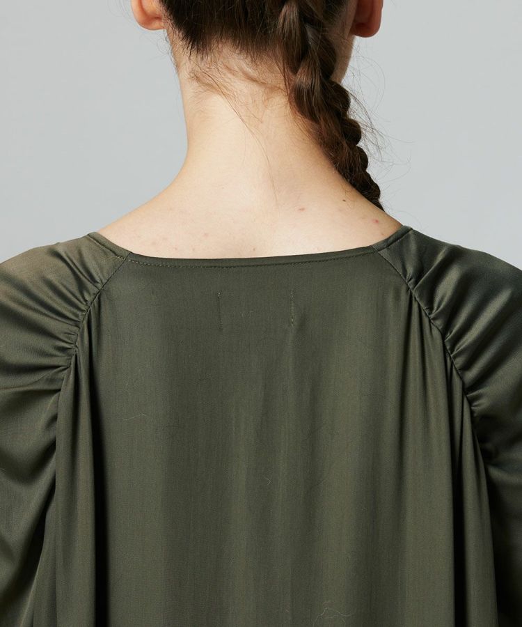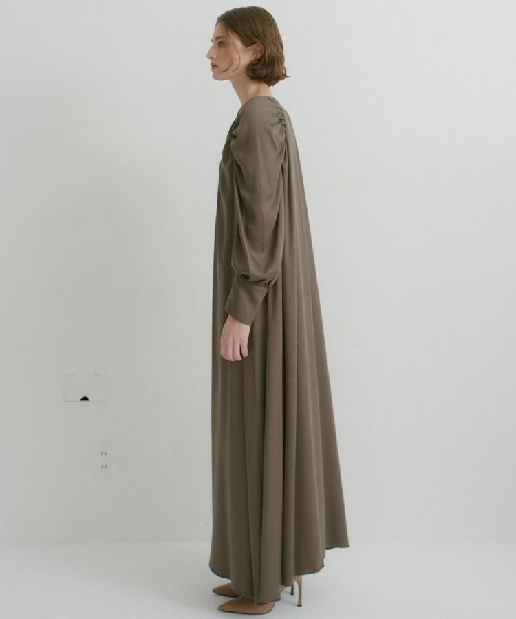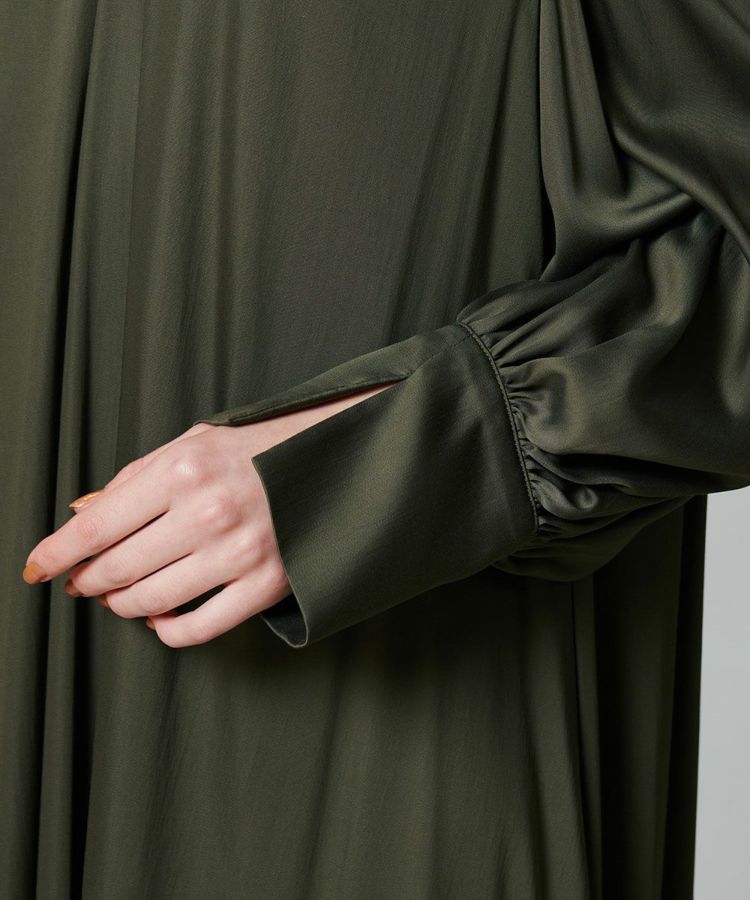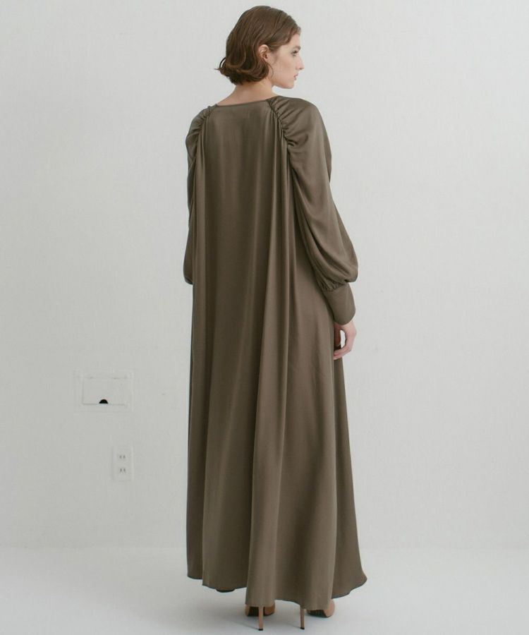 肌の露出を抑えながらも、女性らしくセンシュアルなムードを演出できるマキシ丈のワンピース。シルキーサテンの質感が上品で、しっとりと大人っぽく着用できる一枚です。Vネックや、肩からギャザーをたっぷり効かせたスリーブがポイント。上半身がきれいに見えることで、ストンとしたシルエットが動作のたびに変化し、とてもエレガントです。袖口のカットデザインもさりげないアクセントに。