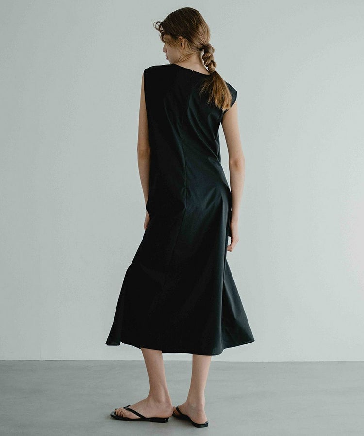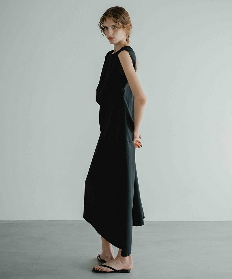上品でシックな佇まいが魅力のワンピース。タイプライター生地を使用し、薄手ながらもほどよいハリとコシを感じられる軽やかな着心地に仕上げました。裾は大胆な斜めカッティングで動きを添え、ミニマルな中にさりげないデザイン性をプラス。合わせるアイテム次第で、カジュアルにもエレガントにも表情を変え、幅広く活躍します。