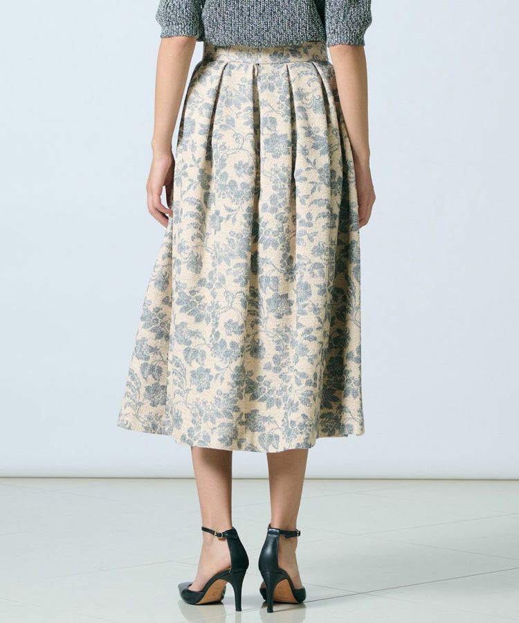 花柄をシックなカラーリングのジャガードで表現したフレアスカート。コットン、ポリエステル、ヴィスコース、麻と、異なる素材を用いたオリジナリティの高い生地は、紡績から仕上げまでを一貫して行うメーカー、イタリア・リチェリ社のものを使用しています。ハリのあるドレープがウエストまわりをカバーしながら、エレガントな雰囲気を演出。これひとつで、おめかし感がぐんと高まるアイテムです。