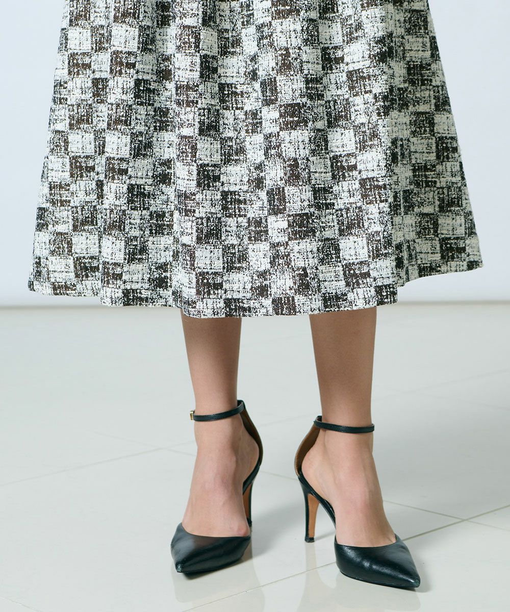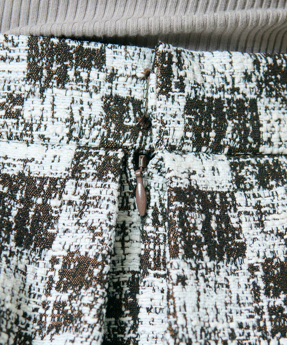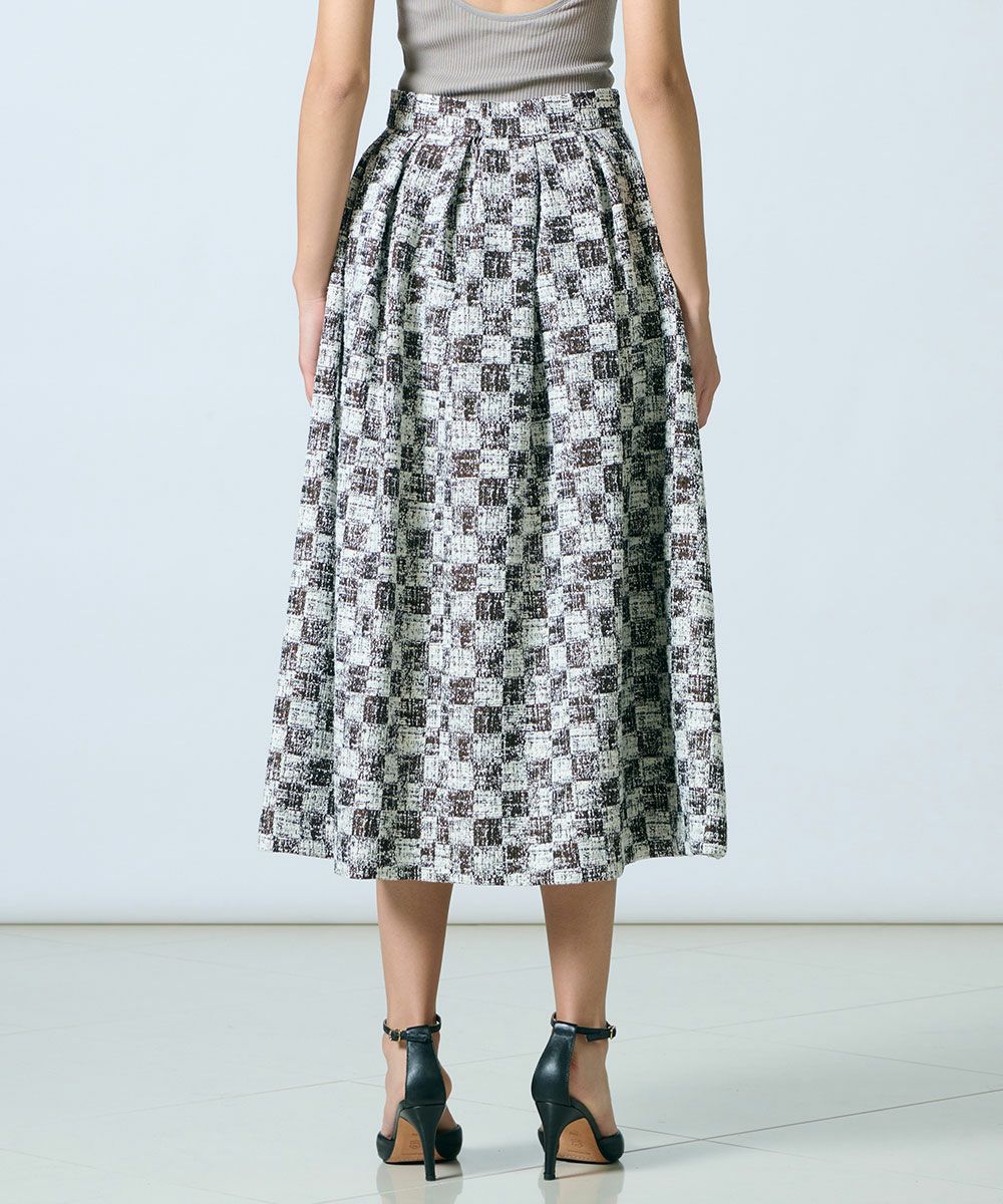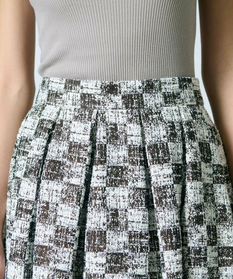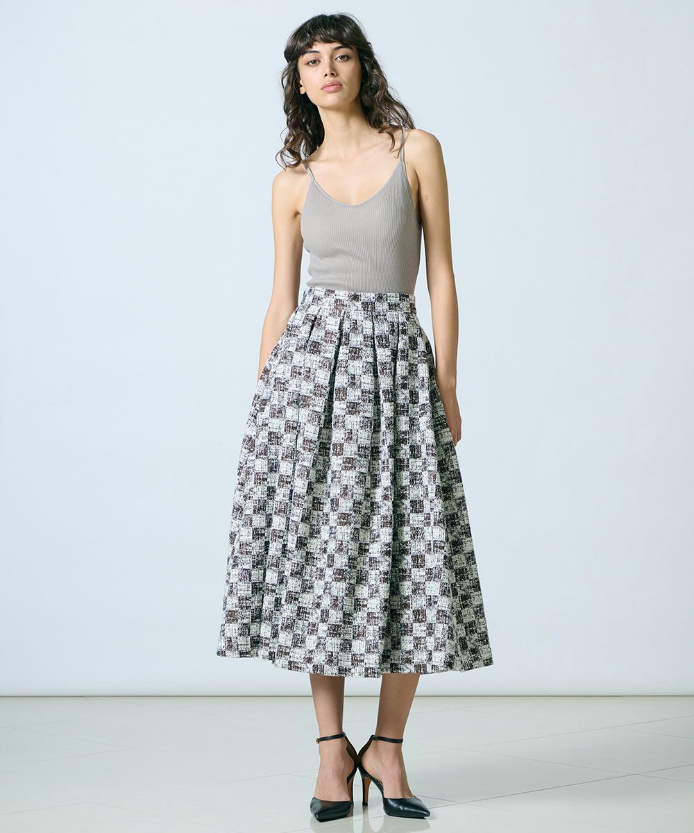ブラウン×ホワイトのミックスツイードがエレガントで柔らかな印象を与えてくれるフレアスカート。表面の凹凸が風合いたっぷりで、イタリア・LINEAESSE社らしいジャガード素材となっています。ドレープがあるため、ウエストやヒップまわりを自然にカバーしてくれるのもうれしいポイント。フレアシルエットは、足元をすっきりと演出します。