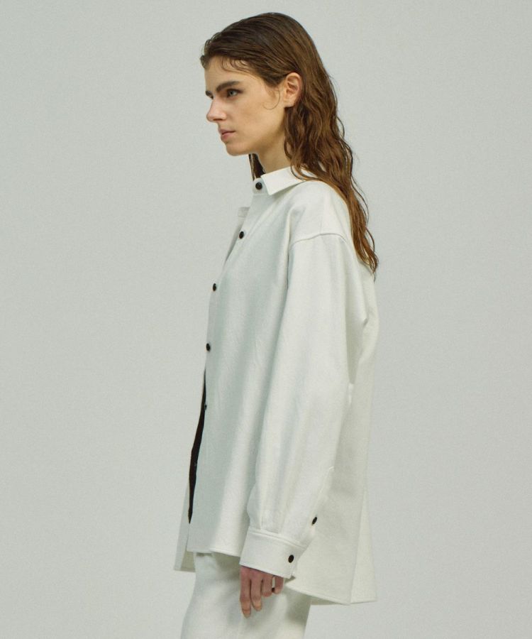 シンプルながらも上品なムードをまとったシャツ。ドレープ性が美しいツイル生地にワッシャー加工を施し、ナチュラルでこなれ感のある風合いに仕上げました。1枚でさらりと着るのはもちろん、インナーを合わせて羽織りとしても活躍。同素材のパンツ(型番:4806061253)と組み合わせれば、洗練されたセットアップスタイルも楽しめます。