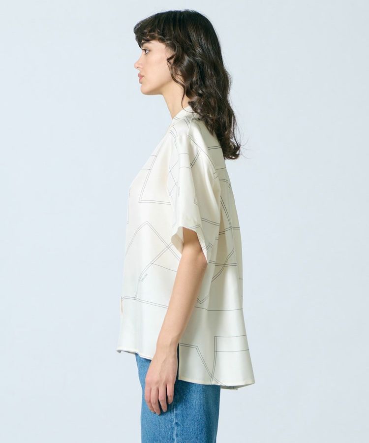 シルク100%の生地に幾何学柄のプリントを施したシャツ。オフホワイトのカラーが爽やかで、上品な印象を与えてくれます。落ち感があるので、シルエットもきれい。リラクシンでありながら、キレイめに着られるアイテムです。天然素材のため通気性がよく、涼しく過ごせるのもうれしいポイント。