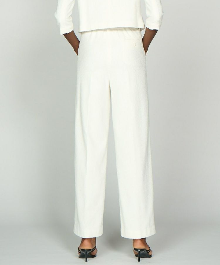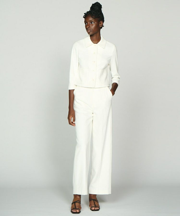 ショート丈のジャケットと好相性なワイドなストレートライン。程よいハリ感と肌触りの良さはフォーマルシーンにも対応。