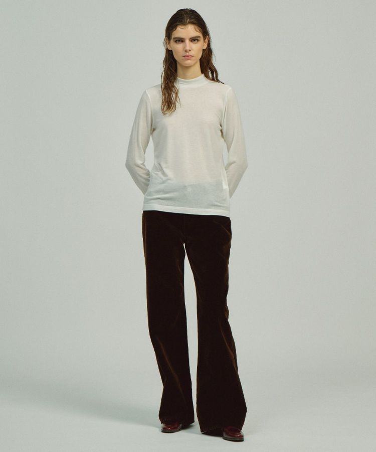 肌触りがなめらかで、心地よい伸縮性を備えたベア天竺素材を使用したカットソー。軽やかなシアー感のある生地は、ほんのりと肌を透かし、女性らしいセンシュアルな雰囲気を演出してくれます。ハイネック仕様なのでジャケットやカーディガンのインナーとしてはもちろん、ワンピースのレイヤードにもおすすめ。1枚でさらっと着れば、抜け感のあるスタイリングが完成し、トレンド感のある今っぽい着こなしを楽しめます。