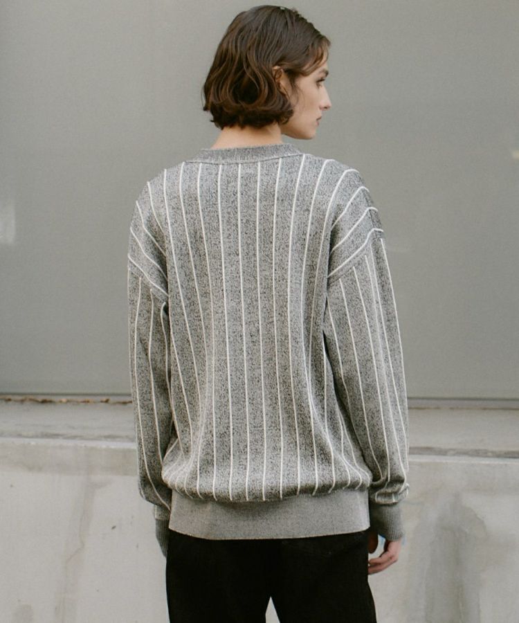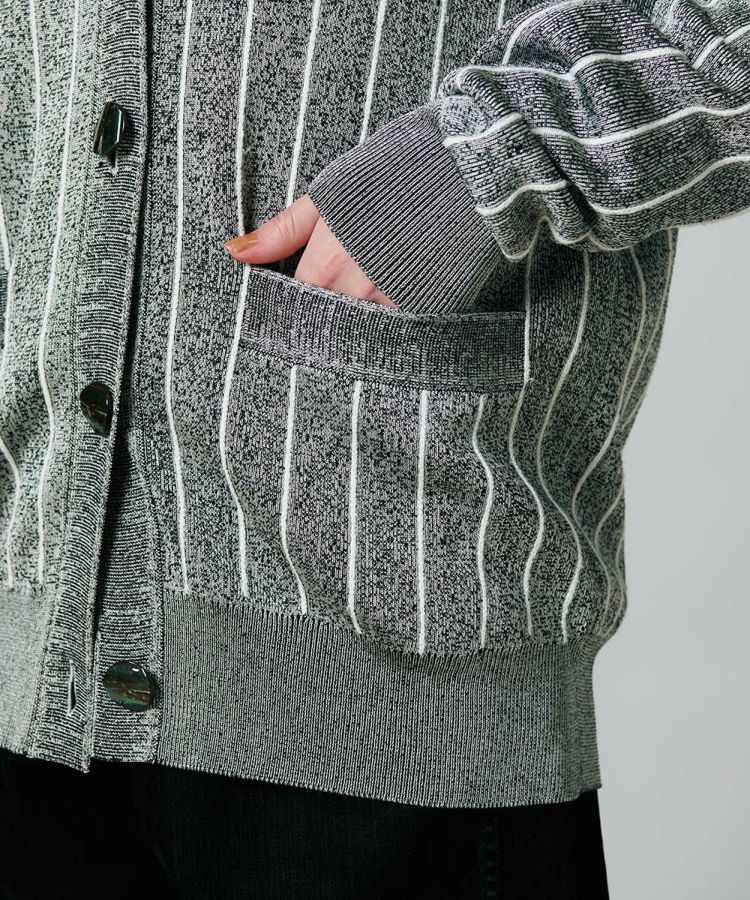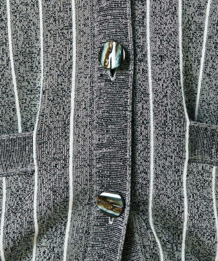 モノトーンのミックスカラーで作ったニットカーディガン。細めのホワイトカラーでストライプを入れ、すっきりとした印象に仕上げました。美しい色合いのボタンもさりげないアクセントに。ゆったりとしたシルエットでラフに着られるのに、大人っぽい落ち着いた雰囲気でコーディネートできるアイテムです。