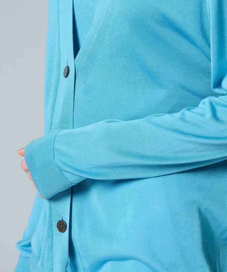 上品な光沢を纏うマルベリーシルクを100%使用したカーディガン。鮮やかなブルーのカラーリングが、春夏らしく爽やかな印象を演出します。保湿性・通気性・保温性に優れ、機能性も兼ね備えた一枚。長めの丈感がさりげなく体型をカバーし、デイリーからきれいめまで幅広いシーンで活躍します。